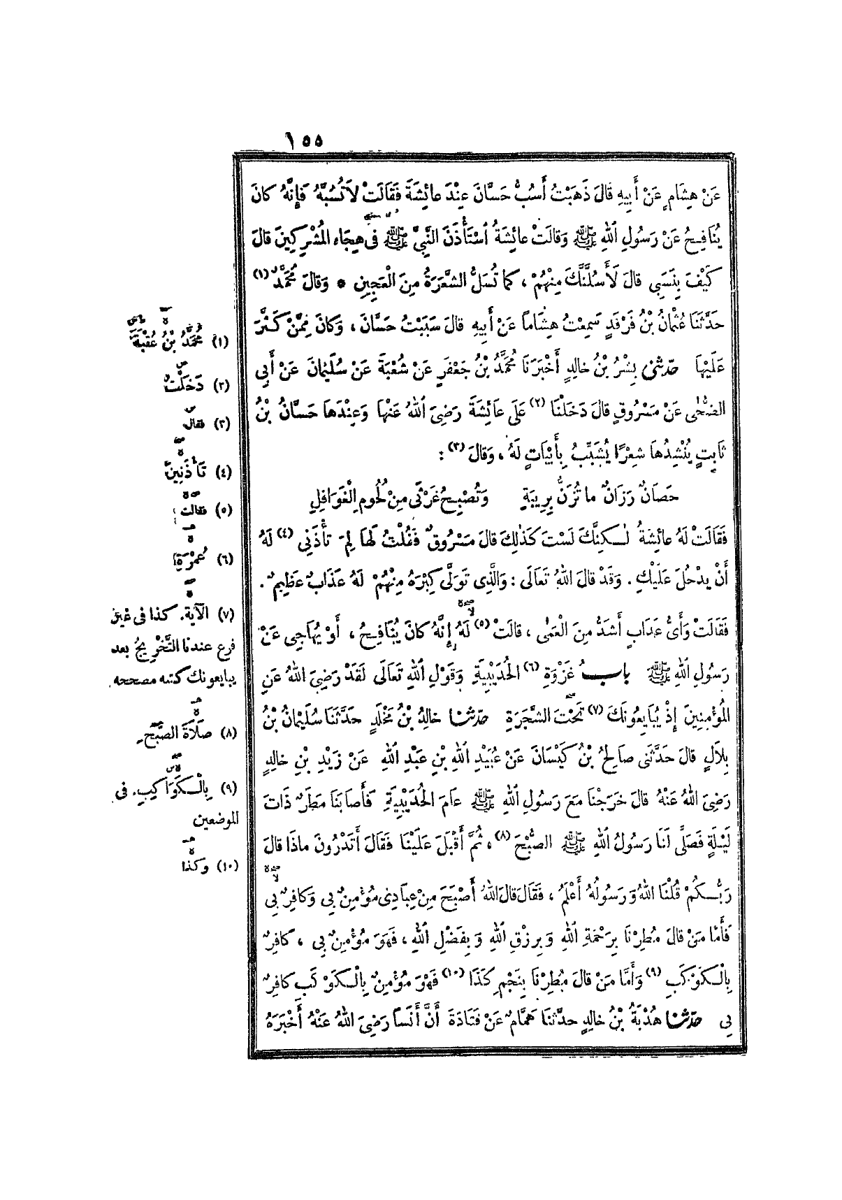 4146- حَدَّثَنِي بِشْرُ بْنُ خَالِدٍ ، أَخْبَرَنَا مُحَمَّدُ بْنُ جَعْفَرٍ ، عَنْ شُعْبَةَ ، عَنْ سُلَيْمَانَ ، عَنْ أَبِي الضُّحَى ، عَنْ مَسْرُوقٍ ، قَالَ : دَخَلْنَا عَلَى عَائِشَةَ ، رَضِيَ اللَّهُ عَنْهَا ، وَعِنْدَهَا حَسَّانُ بْنُ ثَابِتٍ , يُنْشِدُهَا شِعْرًا ، يُشَبِّبُ بِأَبْيَاتٍ لَهُ وَقَالَ :