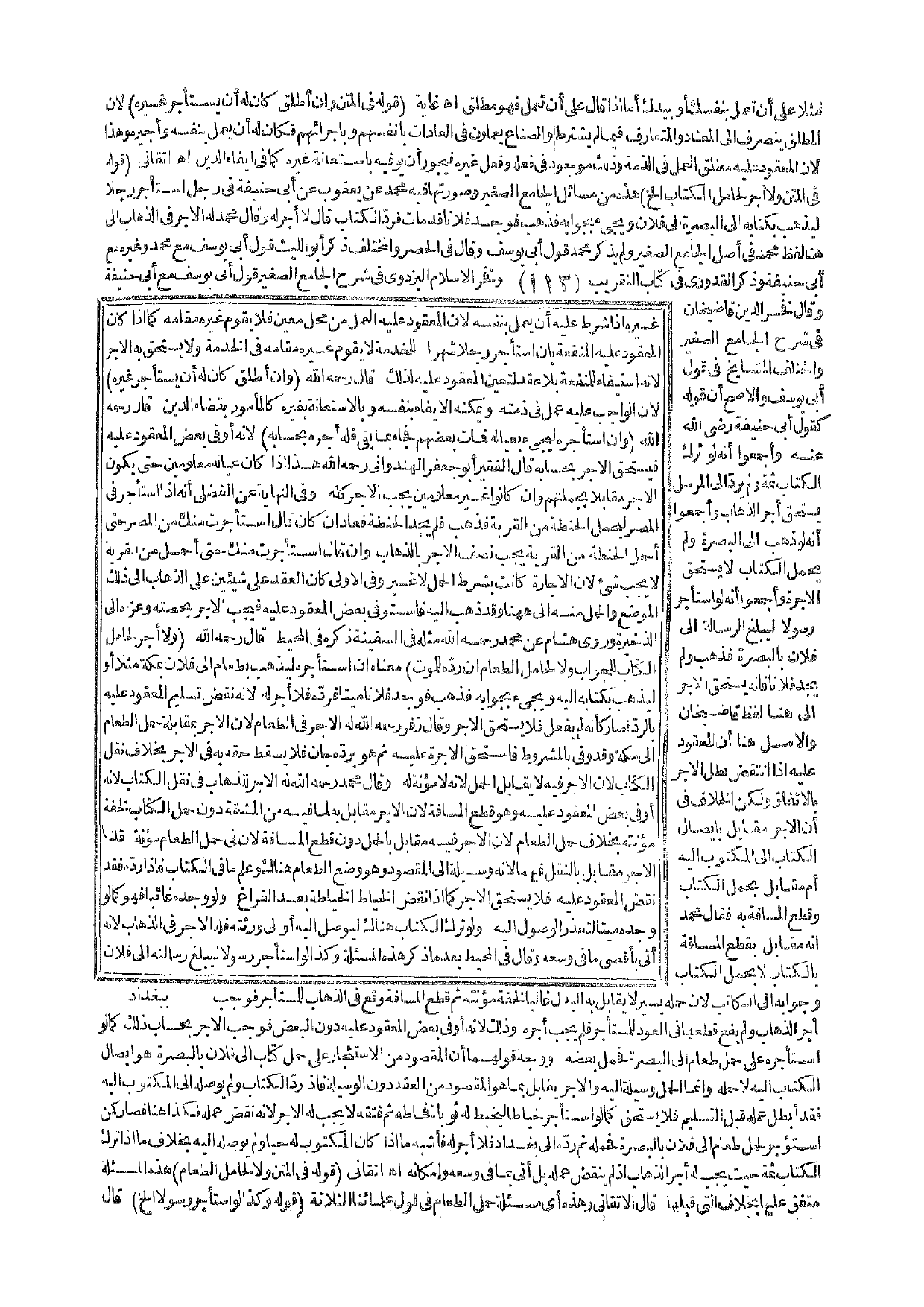 أَنَّهُ لَوْ اسْتَأْجَرَ رَسُولًا لِيُبَلِّغَ الرِّسَالَةَ إلَى فُلَانٍ بِالْبَصْرَةِ فَذَهَبَ وَلَمْ يَجِدْ فُلَانًا فَإِنَّهُ يَسْتَحِقُّ الْأَجْرَ. إلَى هُنَا لَفْظُ قَاضِيخَانْ وَالْأَصْلُ هُنَا أَنَّ الْمَعْقُودَ عَلَيْهِ إذَا انْتَقَضَ بَطَلَ الْأَجْرُ بِالِاتِّفَاقِ وَلَكِنَّ الْخِلَافَ فِي أَنَّ الْأَجْرَ مُقَابَلٌ بِإِيصَالِ الْكِتَابِ إلَى الْمَكْتُوبِ إلَيْهِ أَمْ مُقَابَلٌ بِحَمْلِ الْكِتَابِ وَقَطْعِ الْمَسَافَةِ بِهِ فَقَالَ مُحَمَّدٌ إنَّهُ مُقَابِلٌ بِقَطْعِ الْمَسَافَةِ بِالْكِتَابِ لَا بِحَمْلِ الْكِتَابِ وَجَوَابِهِ إلَى الْكَاتِبِ؛ لِأَنَّ حَمْلَهُ يَسِيرٌ لَا يُقَابِلُ بِهِ الْبَدَلَ غَالِبًا لِخِفَّةِ مُؤْنَتِهِ، ثُمَّ قَطْعُ الْمَسَافَةِ وَقَعَ فِي الذَّهَابِ لِلْمُسْتَأْجِرِ فَوَجَبَ أَجْرُ الذَّهَابِ وَلَمْ يَقَعْ قَطْعُهَا فِي الْعَوْدِ لِلْمُسْتَأْجِرِ فَلَمْ يَجِبْ أَجْرُهُ وَذَلِكَ؛ لِأَنَّهُ أَوْفَى بَعْضَ الْمَعْقُودِ عَلَيْهِ دُونَ الْبَعْضِ فَوَجَبَ الْأَجْرُ بِحِسَابِ ذَلِكَ كَمَا لَوْ اسْتَأْجَرَهُ عَلَى حَمْلِ طَعَامٍ إلَى الْبَصْرَةِ فَحَمَلَ بَعْضَهُ، وَوَجْهُ قَوْلِهِمَا أَنَّ الْمَقْصُودَ مِنْ الِاسْتِئْجَارِ عَلَى حَمْلِ كِتَابٍ إلَى فُلَانٍ بِالْبَصْرَةِ هُوَ إيصَالُ الْكِتَابِ إلَيْهِ لَا حَمْلُهُ وَإِنَّمَا الْحَمْلُ وَسِيلَةٌ إلَيْهِ وَالْأَجْرُ يُقَابَلُ بِمَا هُوَ الْمَقْصُودُ مِنْ الْعَقْدِ دُونَ الْوَسِيلَةِ فَإِذَا رَدَّ الْكِتَابَ وَلَمْ يُوصِلْهُ إلَى الْمَكْتُوبِ إلَيْهِ فَقَدْ أَبْطَلَ عَمَلَهُ قَبْلَ التَّسْلِيمِ فَلَا يَسْتَحِقُّ كَمَا لَوْ اسْتَأْجَرَ خَيَّاطًا لِيَخِيطَ لَهُ ثَوْبًا فَخَاطَهُ، ثُمَّ فَتَّقَهُ لَا يَجِبُ لَهُ الْأَجْرُ؛ لِأَنَّهُ نَقَضَ عَمَلَهُ فَكَذَا هُنَا صَارَ كَمَنْ اُسْتُؤْجِرَ لِحَمْلِ طَعَامٍ إلَى فُلَانٍ بِالْبَصْرَةِ فَحَمَلَهُ، ثُمَّ رَدَّهُ إلَى بَغْدَادَ فَلَا أَجْرَ لَهُ فَأَشْبَهَ مَا إذَا كَانَ الْمَكْتُوبُ لَهُ حَيًّا وَلَمْ يُوصِلْهُ إلَيْهِ بِخِلَافِ مَا إذَا تَرَكَ الْكِتَابَ ثَمَّةَ حَيْثُ يَجِبُ لَهُ أَجْرُ الذَّهَابِ وَمَا إذَا لَمْ يَنْقُضْ عَمَلَهُ بَلْ أَتَى بِمَا فِي وُسْعِهِ وَإِمْكَانِهِ. اهـ. أَتْقَانِيٌّ (قَوْلُهُ فِي الْمَتْنِ وَلَا لِحَامِلِ الطَّعَامِ) هَذِهِ الْمَسْأَلَةُ مُتَّفَقٌ عَلَيْهَا بِخِلَافِ الَّتِي قَبْلَهَا قَالَ الْأَتْقَانِيُّ وَهَذِهِ أَيْ مَسْأَلَةُ حَمْلِ الطَّعَامِ فِي قَوْلِ عُلَمَائِنَا الثَّلَاثَةِ (قَوْلُهُ، وَكَذَا لَوْ اسْتَأْجَرَ رَسُولًا إلَخْ) قَالَ