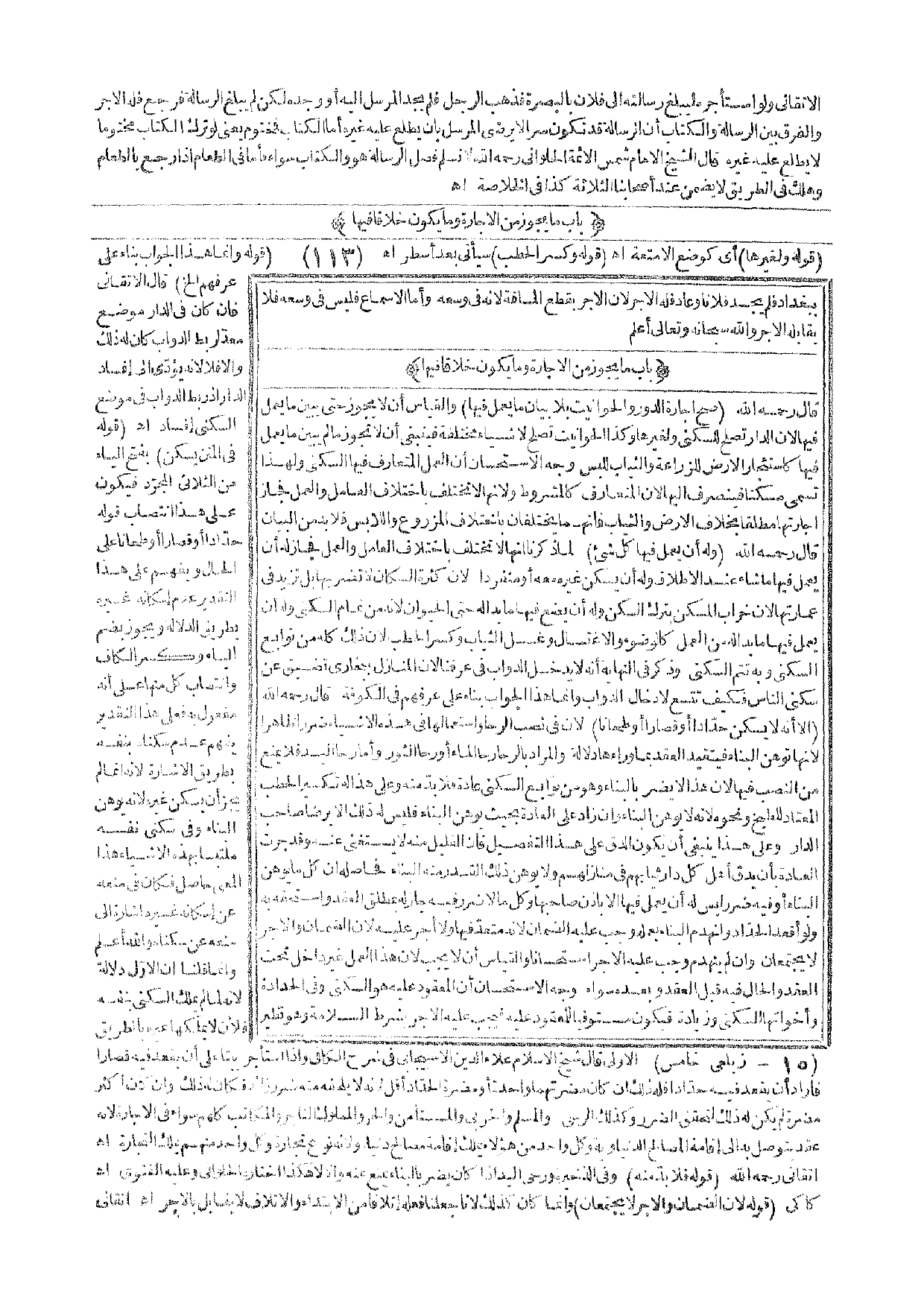 (بَابُ مَا يَجُوزُ مِنْ الْإِجَارَةِ وَمَا يَكُونُ خِلَافًا فِيهَا) (قَوْلُهُ وَلِغَيْرِهَا) أَيْ كَوَضْعِ الْأَمْتِعَةِ اهـ (قَوْلُهُ وَكَسْرِ الْحَطَبِ) سَيَأْتِي بَعْدَ أَسْطُرٍ. اهـ. (قَوْلُهُ وَإِنَّمَا هَذَا الْجَوَابُ بِنَاءً عَلَى عُرْفِهِمْ إلَخْ) قَالَ الْأَتْقَانِيُّ فَإِنْ كَانَ فِي الدَّارِ مَوْضِعٌ مُعَدٌّ لِرَبْطِ الدَّوَابِّ كَانَ لَهُ ذَلِكَ وَإِلَّا فَلَا؛ لِأَنَّهُ يُؤَدِّي إلَى إفْسَادِ الدَّارِ إذْ رَبْطُ الدَّوَابَّ فِي مَوْضِعِ السُّكْنَى إفْسَادٌ. اهـ. (قَوْلُهُ فِي الْمَتْنِ يَسْكُنُ) بِفَتْحِ الْيَاءِ مِنْ الثَّلَاثِي الْمُجَرَّدِ فَيَكُونُ عَلَى هَذَا انْتِصَابُ قَوْلِهِ حَدَّادًا أَوْ قَصَّارًا أَوْ طَحَّانًا عَلَى الْحَالِ وَيُفْهَمُ عَلَى هَذَا التَّقْدِيرِ عَدَمُ إسْكَانِهِ غَيْرَهُ بِطَرِيقِ الدَّلَالَةِ وَيَجُوزُ بِضَمِّ الْيَاءِ وَكَسْرِ الْكَافِ وَانْتِصَابِ كُلٍّ مِنْهَا عَلَى أَنَّهُ مَفْعُولٌ بِهِ فَعَلَى هَذَا التَّقْدِيرِ يُفْهَمُ عَدَمُ سُكْنَاهُ بِنَفْسِهِ بِطَرِيقِ الْإِشَارَةِ؛ لِأَنَّهُ إنَّمَا لَمْ يَجُزْ أَنْ يُسْكِنَ غَيْرَهُ؛ لِأَنَّهُ يُوهِنُ الْبِنَاءَ وَفِي سُكْنَى نَفْسِهِ مُتَلَبِّسًا بِهَذِهِ الْأَشْيَاءِ وَهَذَا الْمَعْنَى حَاصِلٌ فَكَانَ فِي مَنْعِهِ عَنْ إسْكَانِهِ غَيْرُ إشَارَةٍ إلَى مَنْعِهِ عَنْ سُكْنَاهُ وَاَللَّهُ أَعْلَمُ وَإِنَّمَا قُلْنَا إنَّ الْأَوَّلَ دَلَالَةٌ؛ لِأَنَّهُ لَمَّا لَمْ يَمْلِكْ السُّكْنَى بِنَفْسِهِ فَلَأَنْ لَا يُمَلِّكَهَا غَيْرُهُ بِالطَّرِيقِ الْأَوْلَى قَالَ شَيْخُ الْإِسْلَامِ عَلَاءُ الدِّينِ الْإِسْبِيجَابِيُّ فِي شَرْحِ الْكَافِي، وَإِذَا اسْتَأْجَرَ بَيْتًا عَلَى أَنْ يُقْعِدَ فِيهِ قَصَّارًا فَأَرَادَ أَنْ يُقْعِدَ فِيهِ حَدَّادًا فَلَهُ ذَلِكَ إنْ كَانَ مَضَرَّتُهُمَا وَاحِدَةً أَوْ مَضَرَّةُ الْحَدَّادِ أَقَلَّ؛ لِأَنَّهُ لَا يَلْحَقُهُ مِنْهُ ضَرَرٌ زَائِدٌ فَكَانَ لَهُ ذَلِكَ، وَإِنْ كَانَ أَكْثَرَ مَضَرَّةً لَمْ يَكُنْ لَهُ ذَلِكَ لِتَحَقُّقِ الضَّرَرِ، وَكَذَلِكَ الرَّحَى، وَالْمُسْلِمُ وَالْحَرْبِيُّ وَالْمُسْتَأْمِنُ وَالْحُرُّ وَالْمَمْلُوكُ التَّاجِرُ وَالْمُكَاتَبُ كُلُّهُمْ سَوَاءٌ فِي الْإِجَارَةِ؛ لِأَنَّهُ عَقْدٌ يُتَوَصَّلُ بِهِ إلَى إقَامَةِ الْمَصَالِحِ الدُّنْيَوِيَّةِ وَكُلُّ وَاحِدٍ مِنْ هَؤُلَاءِ يَمْلِكُ إقَامَةَ مَصَالِحِ دُنْيَاهُ وَلِأَنَّهُ نَوْعُ تِجَارَةٍ وَكُلُّ وَاحِدٍ مِنْهُمْ يَمْلِكُ التِّجَارَةَ. اهـ. أَتْقَانِيٌّ - رَحِمَهُ اللَّهُ - (قَوْلُهُ فَلَا بُدَّ مِنْهُ) وَفِي الذَّخِيرَةِ وَرَحَى الْيَدِ إذَا كَانَ يَضُرُّ بِالْبِنَاءِ يُمْنَعُ عَنْهُ وَإِلَّا لَا هَكَذَا اخْتَارَهُ الْحَلْوَانِيُّ وَعَلَيْهِ الْفَتْوَى. اهـ. كَاكِيٌّ (قَوْلُهُ لِأَنَّ الضَّمَانَ وَالْأَجْرَ لَا يَجْتَمِعَانِ) وَإِنَّمَا كَانَ كَذَلِكَ؛ لِأَنَّا جَعَلْنَا فِعْلَهُ إتْلَافًا مِنْ الِابْتِدَاءِ وَالْإِتْلَافُ لَا يُقَابَلُ بِالْأَجْرِ. اهـ. أَتْقَانِيٌّ