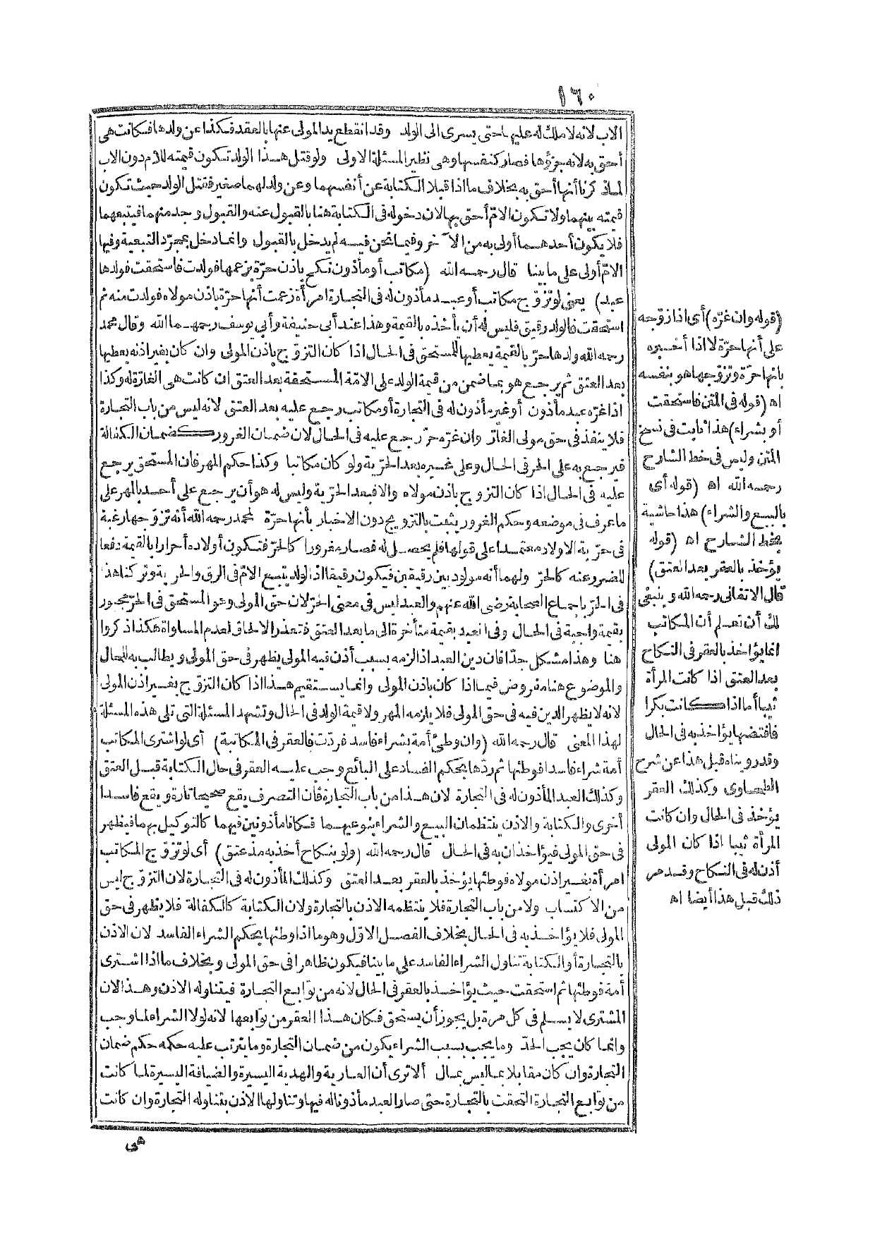 قَالَ - رَحِمَهُ اللَّهُ - (وَلَوْ بِنِكَاحٍ أُخِذَ بِهِ مُذْ عَتَقَ) أَيْ لَوْ تَزَوَّجَ الْمُكَاتَبُ امْرَأَةً بِغَيْرِ إذْنِ مَوْلَاهُ فَوَطِئَهَا يُؤْخَذُ بِالْعُقْرِ بَعْدَ الْعِتْقِ، وَكَذَلِكَ الْمَأْذُونُ لَهُ فِي التِّجَارَةِ؛ لِأَنَّ التَّزَوُّجَ لَيْسَ مِنْ الِاكْتِسَابِ وَلَا مِنْ بَابِ التِّجَارَةِ فَلَا يَنْتَظِمُهُ الْإِذْنُ بِالتِّجَارَةِ وَلِأَنَّ الْكِتَابَةَ كَالْكَفَالَةِ فَلَا يَظْهَرُ فِي حَقِّ الْمَوْلَى فَلَا يُؤَاخَذُ بِهِ فِي الْحَالِ بِخِلَافِ الْفَصْلِ الْأَوَّلِ وَهُوَ مَا إذَا وَطِئَهَا بِحُكْمِ الشِّرَاءِ الْفَاسِدِ؛ لِأَنَّ الْإِذْنَ بِالتِّجَارَةِ أَوْ بِالْكِتَابَةِ تَنَاوَلَ الشِّرَاءَ الْفَاسِدَ عَلَى مَا بَيَّنَّا فَيَكُونُ ظَاهِرًا فِي حَقِّ الْمَوْلَى وَبِخِلَافِ مَا إذَا اشْتَرَى أَمَةً فَوَطِئَهَا، ثُمَّ اُسْتُحِقَّتْ حَيْثُ يُؤَاخَذُ بِالْعُقْرِ فِي الْحَالِ؛ لِأَنَّهُ مِنْ تَوَابِعِ التِّجَارَةِ فَيَتَنَاوَلُهُ الْإِذْنُ، وَهَذَا لِأَنَّ الْمُشْتَرِيَ لَا يُسَلِّمُ فِي كُلِّ مَرَّةٍ بَلْ يَجُوزُ أَنْ يَسْتَحِقَّ فَكَانَ هَذَا الْعُقْرُ مِنْ تَوَابِعِهَا؛ لِأَنَّهُ لَوْلَا الشِّرَاءُ لَمَا وَجَبَ، وَإِنَّمَا كَانَ يَجِبُ الْحَدُّ وَمَا يَجِبُ بِسَبَبِ الشِّرَاءِ يَكُونُ مِنْ ضَمَانِ التِّجَارَةِ وَمَا يَتَرَتَّبُ عَلَيْهِ حُكْمُهُ حُكْمُ ضَمَانِ التِّجَارَةِ، وَإِنْ كَانَ مُقَابَلًا بِمَا لَيْسَ بِمَالٍ. أَلَا تَرَى أَنَّ الْعَارِيَّةُ وَالْهَدِيَّةَ الْيَسِيرَةَ وَالضِّيَافَةَ الْيَسِيرَةَ لَمَّا كَانَتْ مِنْ تَوَابِعِ التِّجَارَةِ الْتَحَقَتْ بِالتِّجَارَةِ حَتَّى صَارَ الْعَبْدُ مَأْذُونًا لَهُ فِيهَا وَتَنَاوَلَهَا الْإِذْنُ بِتَنَاوُلِهِ التِّجَارَةَ، وَإِنْ كَانَتْ