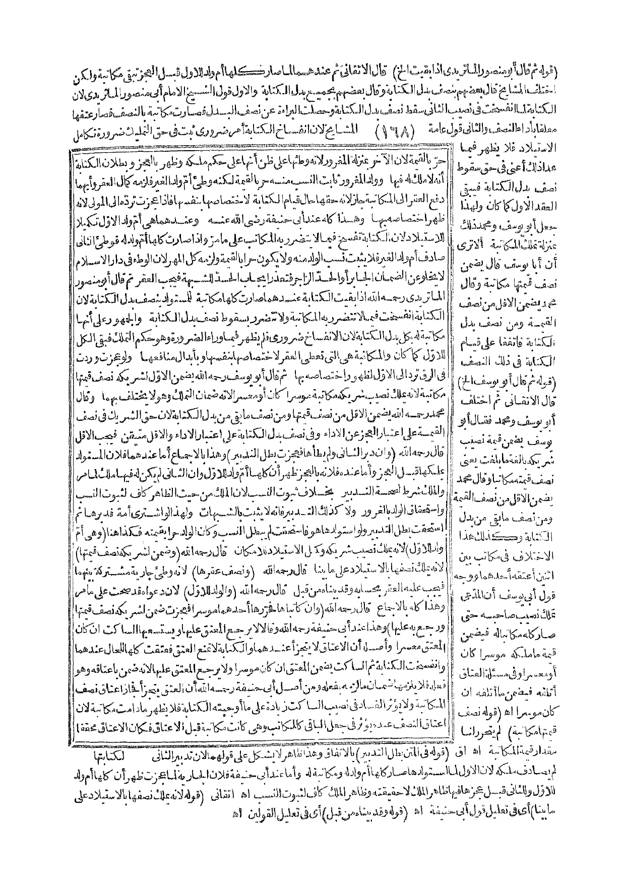 ـــــــــــــــــــــــــــــQقَوْلُهُ ثُمَّ قَالَ أَبُو مَنْصُورٍ الْمَاتُرِيدِيُّ إذَا بَقِيَتْ إلَخْ) قَالَ الْأَتْقَانِيُّ ثُمَّ عِنْدَهُمَا لَمَّا صَارَ كُلُّهَا أُمَّ وَلَدٍ لِلْأَوَّلِ قَبْلَ الْعَجْزِ تَبْقَى مُكَاتَبَةً وَلَكِنْ اخْتَلَفَ الْمَشَايِخُ قَالَ بَعْضُهُمْ بِنِصْفِ بَدَلِ الْكِتَابَةِ وَقَالَ بَعْضُهُمْ بِجَمِيعِ بَدَلِ الْكِتَابَةِ وَالْأَوَّلُ قَوْلُ الشَّيْخِ الْإِمَامِ أَبِي مَنْصُورٍ الْمَاتُرِيدِيِّ؛ لِأَنَّ الْكِتَابَةَ لَمَّا انْفَسَخَتْ فِي نَصِيبِ الثَّانِي سَقَطَ نِصْفُ بَدَلِ الْكِتَابَةِ وَحَصَلَتْ الْبَرَاءَةُ عَنْ نِصْفِ الْبَدَلِ فَصَارَتْ مُكَاتَبَةً بِالنِّصْفِ فَصَارَ عِتْقُهَا مُعَلَّقًا بِأَدَاءِ النِّصْفِ وَالثَّانِي قَوْلُ عَامَّةِ الْمَشَايِخِ؛ لِأَنَّ انْفِسَاخَ الْكِتَابَةِ أَمْرٌ ضَرُورِيٌّ ثَبَتَ فِي حَقِّ التَّمْلِيكِ ضَرُورَةَ تَكَامُلِ الِاسْتِيلَادِ فَلَا يَظْهَرُ فِيمَا عَدَا ذَلِكَ أَعْنِي فِي حَقِّ سُقُوطِ نِصْفِ بَدَلِ الْكِتَابَةِ فَيَبْقَى الْعَقْدُ الْأَوَّلُ كَمَا كَانَ، وَلِهَذَا جَعَلَ أَبُو يُوسُفَ وَمُحَمَّدٌ ذَلِكَ بِمَنْزِلَةِ تَمَلُّكِ الْمُكَاتَبَةِ، أَلَا تَرَى أَنَّ أَبَا يُوسُفَ قَالَ يَضْمَنُ نِصْفَ قِيمَتِهَا مُكَاتَبَةً، وَقَالَ مُحَمَّدٌ يَضْمَنُ الْأَقَلَّ مِنْ نِصْفِ الْقِيمَةِ وَمِنْ نِصْفِ بَدَلِ الْكِتَابَةِ فَاتَّفَقَا عَلَى قِيَامِ الْكِتَابَةِ فِي ذَلِكَ النِّصْفِ.