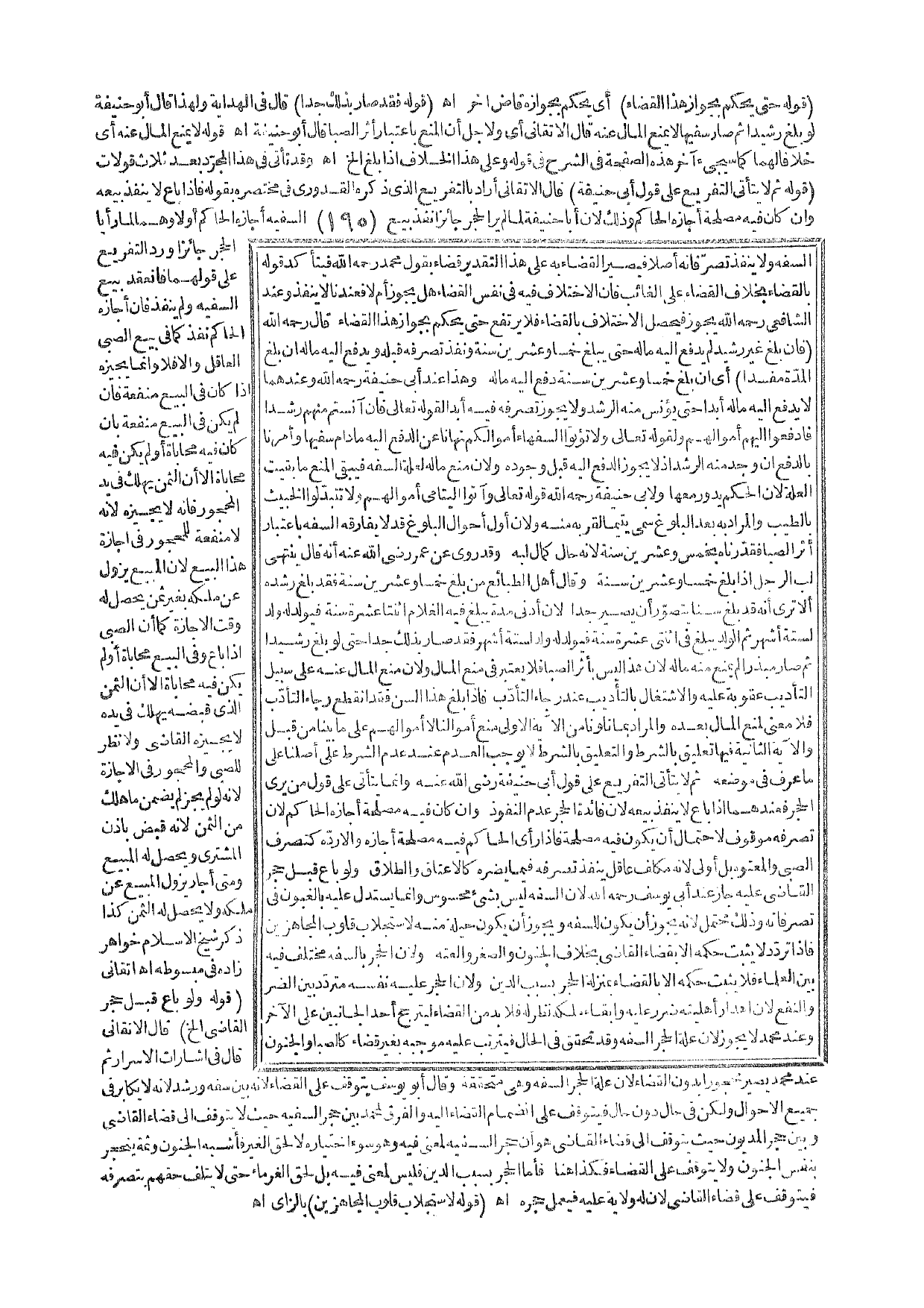 السَّفَهِ وَلَا يَنْفُذُ تَصَرُّفَاتُهُ أَصْلًا فَيَصِيرُ الْقَضَاءُ بِهِ عَلَى هَذَا التَّقْدِيرِ قَضَاءً بِقَوْلِ مُحَمَّدٍ - رَحِمَهُ اللَّهُ - فَيَتَأَكَّدُ قَوْلُهُ بِالْقَضَاءِ بِخِلَافِ الْقَضَاءِ عَلَى الْغَائِبِ فَإِنَّ الِاخْتِلَافَ فِيهِ فِي نَفْسِ الْقَضَاءِ هَلْ يَجُوزُ أَمْ لَا فَعِنْدَنَا لَا يَنْفُذُ وَعِنْدَ الشَّافِعِيِّ - رَحِمَهُ اللَّهُ - يَجُوزُ فَيَحْصُلُ الِاخْتِلَافُ بِالْقَضَاءِ فَلَا يَرْتَفِعُ حَتَّى يُحْكَمَ بِجَوَازِ هَذَا الْقَضَاءِ.