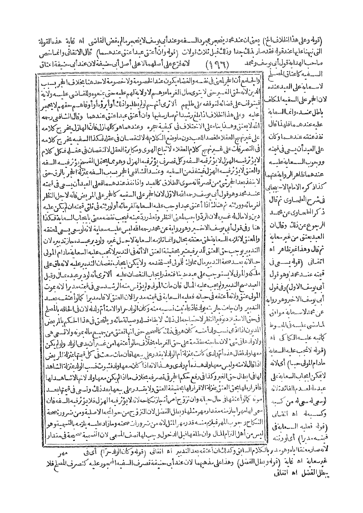 ـــــــــــــــــــــــــــــQقَوْلُهُ وَعَلَى هَذَا الْخِلَافِ إلَخْ) يَعْنِي أَنَّ عِنْدَ مُحَمَّدٍ يَنْحَجِرُ بِمُجَرَّدِ السَّفَهِ وَعِنْدَ أَبِي يُوسُفَ لَا يَنْحَجِرُ مَا لَمْ يَقْضِ الْقَاضِي. اهـ. غَايَةٌ. هَذِهِ الْقَوْلَةُ الَّتِي نَبَّهْنَا عَلَيْهَا عِنْدَ قَوْلِهِ فَقَدْ صَارَ بِذَلِكَ جَدًّا وَذَلِكَ قَبْلَ ثَلَاثِ قَوْلَاتٍ (قَوْلُهُ وَإِنْ أَعْتَقَ عَبْدًا عَتَقَ عِنْدَهُمَا) قَالَ الْأَتْقَانِيُّ وَإِنَّمَا خَصَّ صَاحِبُ الْهِدَايَةِ قَوْلَ أَبِي يُوسُفَ وَمُحَمَّدٍ؛ لِأَنَّهُ فَرْعٌ عَلَى أَصْلِهِمَا لَا عَلَى أَصْلِ أَبِي حَنِيفَةَ؛ لِأَنَّ عِنْدَ أَبِي حَنِيفَةَ إعْتَاقُ السَّفِيهِ كَإِعْتَاقِ الْمُصْلِحِ لَا سِعَايَةَ عَلَى الْعَبْدِ عِنْدَهُ؛ لِأَنَّ الْحَجْرَ عَلَى السَّفِيهِ الْمُكَلَّفِ بَاطِلٌ عِنْدَهُ وَإِنَّمَا السِّعَايَةُ عَلَيْهِ عِنْدَهُمَا فَلِهَذَا قَالَ نَفَذَ عِتْقُهُ عِنْدَهُمَا وَكَانَ عَلَى الْعَبْدِ أَنْ يَسْعَى فِي قِيمَتِهِ وَوُجُوبُ السِّعَايَةِ عَلَيْهِ عِنْدَهُمَا ظَاهِرُ الرِّوَايَةِ عَنْهُمَا كَذَا ذَكَرَهُ الْإِمَامُ الْإِسْبِيجَابِيُّ فِي شَرْحِ الطَّحَاوِيِّ ثُمَّ قَالَ ذَكَرَ الطَّحَاوِيُّ عَنْ مُحَمَّدٍ الرُّجُوعَ عَنْ ذَلِكَ، وَقَالَ: إنَّ الْعَبْدَ يَعْتِقُ مِنْ غَيْرِ سِعَايَةٍ ثُمَّ قَالَ: وَهَذَا غَيْرُ ظَاهِرٍ. اهـ. أَتْقَانِيٌّ.