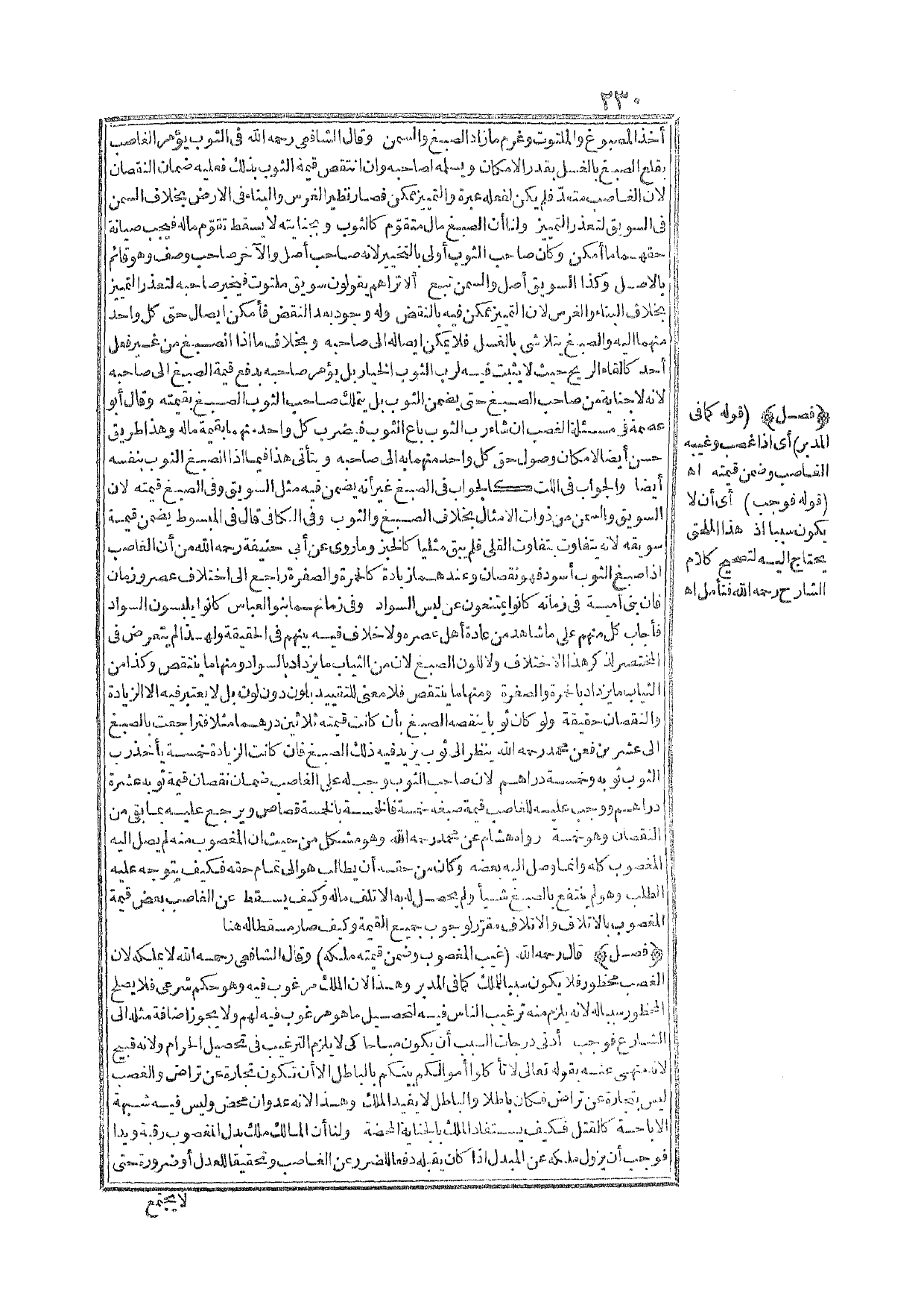 وَقَالَ أَبُو عِصْمَةَ فِي مَسْأَلَةِ الْغَصْبِ: إنْ شَاءَ رَبُّ الثَّوْبِ بَاعَ الثَّوْبَ فَيَضْرِبُ كُلُّ وَاحِدٍ مِنْهُمَا بِقِيمَةِ مَالِهِ، وَهَذَا طَرِيقٌ حَسَنٌ أَيْضًا لِإِمْكَانِ وُصُولِ حَقِّ كُلِّ وَاحِدٍ مِنْهُمَا بِهِ إلَى صَاحِبِهِ وَيَتَأَتَّى هَذَا فِيمَا إذَا انْصَبَغَ الثَّوْبُ بِنَفْسِهِ أَيْضًا. وَالْجَوَابُ فِي اللَّتِّ كَالْجَوَابِ فِي الصَّبْغِ غَيْرَ أَنَّهُ يَضْمَنُ فِيهِ مِثْلَ السَّوِيقِ، وَفِي الصَّبْغِ قِيمَتُهُ؛ لِأَنَّ السَّوِيقَ وَالسَّمْنَ مِنْ ذَوَاتِ الْأَمْثَالِ بِخِلَافِ الصَّبْغِ وَالثَّوْبِ، وَفِي الْكَافِي قَالَ فِي الْمَبْسُوطِ يَضْمَنُ قِيمَةَ سَوِيقِهِ؛ لِأَنَّهُ يَتَفَاوَتُ بِتَفَاوُتِ الْقَلْيِ فَلَمْ يَبْقَ مِثْلِيًّا كَالْخُبْزِ، وَمَا رُوِيَ عَنْ أَبِي حَنِيفَةَ - رَحِمَهُ اللَّهُ - مِنْ أَنَّ الْغَاصِبَ إذَا صَبَغَ الثَّوْبَ أَسْوَدَ فَهُوَ نُقْصَانٌ، وَعِنْدَهُمَا زِيَادَةٌ كَالْحُمْرَةِ وَالصُّفْرَةِ رَاجِعٌ إلَى اخْتِلَافِ عَصْرٍ وَزَمَانٍ فَإِنَّ بَنِي أُمَيَّةَ فِي زَمَانِهِ كَانُوا يَمْتَنِعُونَ عَنْ لُبْسِ السَّوَادِ، وَفِي زَمَانِهِمَا بَنُو الْعَبَّاسِ كَانُوا يَلْبَسُونَ السَّوَادَ فَأَجَابَ كُلٌّ مِنْهُمْ عَلَى مَا شَاهَدَ مِنْ عَادَةِ أَهْلِ عَصْرِهِ، وَلَا خِلَافَ فِيهِ بَيْنَهُمْ فِي الْحَقِيقَةِ وَلِهَذَا لَمْ يَتَعَرَّضْ فِي الْمُخْتَصَرِ لِذِكْرِ هَذَا الِاخْتِلَافِ، وَلَا لِلَوْنِ الصَّبْغِ؛ لِأَنَّ مِنْ الثِّيَابِ مَا يَزْدَادُ بِالسَّوَادِ
