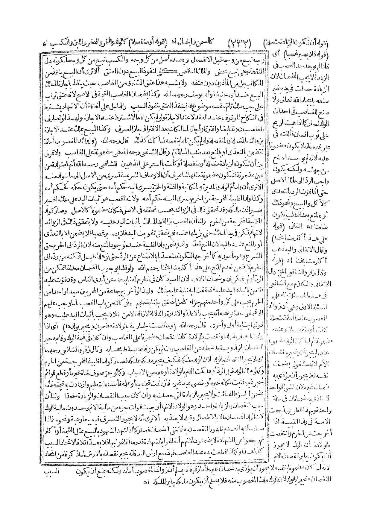 ـــــــــــــــــــــــــــــQقَوْلُهُ: أَنْ تَكُونَ الزِّيَادَةُ مُتَّصِلَةً) كَالسِّمَنِ وَالْجَمَالِ. اهـ. (قَوْلُهُ: أَوْ مُنْفَصِلَةً) كَالْوَلَدِ وَالثَّمَرِ وَالْعُقْرِ وَاللَّبَنِ وَالْكَسْبِ. اهـ. (قَوْلُهُ: فَلَا يَصِيرُ غَصْبًا) أَيْ فَإِذَا لَمْ يُوجَدْ حَدُّ الْغَصْبِ فِي الزِّيَادَةِ لَا يَجِبُ الضَّمَانُ؛ لِأَنَّ الزِّيَادَةَ حَصَلَتْ فِي يَدِهِ بِغَيْرِ صُنْعِهِ بِإِيجَادِ اللَّهِ تَعَالَى، وَلَا صُنْعَ لِلْغَاصِبِ فِي إحْدَاثِ الْوَلَدِ فَصَارَ كَمَا إذَا هَبَّتْ الرِّيحُ عَلَى ثَوْبِ إنْسَانٍ فَأَلْقَتْهُ فِي حِجْرِ غَيْرِهِ فَإِنَّهُ لَا يَكُونُ مَضْمُونًا عَلَيْهِ لِأَنَّهُ لَمْ يُوجَدْ الصُّنْعُ مِنْ جِهَتِهِ، وَلَكِنَّهُ يَكُونُ وَاجِبَ الرَّدِّ إلَى مَالِكِ الْأَصْلِ حَتَّى إذَا فَوَّتَ الرَّدَّ بِالتَّعَدِّي كَالْأَكْلِ وَالْبَيْعِ وَنَحْوِ ذَلِكَ أَوْ بِالْمَنْعِ بَعْدَ الطَّلَبِ يَكُونُ ضَامِنًا. اهـ أَتْقَانِيٌّ. (قَوْلُهُ: عَلَى هَذَا أَكْثَرُ مَشَايِخِنَا)، وَقَالَ الْأَتْقَانِيُّ: وَإِلَيْهِ ذَهَبَ أَكْثَرُ مَشَايِخِنَا. اهـ. .