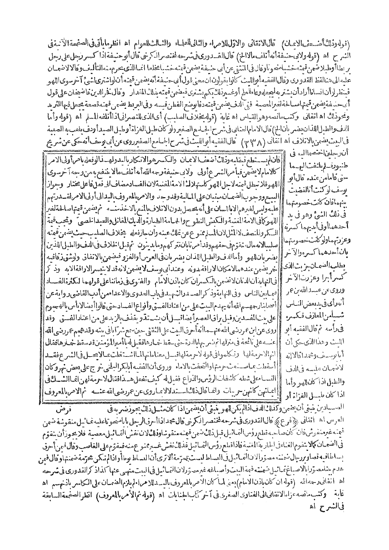 (فَرْعٌ) قَالَ الْقُدُورِيُّ فِي شَرْحِهِ لِمُخْتَصَرِ الْكَرْخِيِّ قَالَ مُحَمَّدٌ إذَا أَحْرَقَ الرَّجُلُ بَابًا مَنْحُوتًا عَلَيْهِ تَمَاثِيلُ مَنْقُوشَةٌ ضَمِنَ قِيمَتَهُ غَيْرَ مَنْقُوشٍ فَإِنْ كَانَ صَاحِبُهُ قَطَعَ رُءُوسَ التَّمَاثِيلِ قَبْلَ ذَلِكَ ضَمِنَ قِيمَتَهُ مَنْقُوشًا، وَذَلِكَ؛ لِأَنَّ نَقْشَ التَّمَاثِيلِ مَعْصِيَةٌ فَلَا يَجُوزُ أَنْ يُتَقَوَّمَ فِي الضَّمَانِ كَمَا لَا يَتَقَوَّمُ الْغِنَاءُ فِي الْجَارِيَةِ الْمُغَنِّيَةِ فَإِذَا قَطَعَ رُءُوسَ التَّمَاثِيلِ فَذَلِكَ نَقْشٌ غَيْرُ مَمْنُوعٍ مِنْهُ فَيُقَوَّمُ عَلَى الْغَاصِبِ، وَقَالَ فِيمَنْ أَحْرَقَ بِسَاطًا فِيهِ تَصَاوِيرُ رِجَالٍ ضَمَّنْته مُصَوَّرًا لِأَنَّ التَّمَاثِيلَ فِي الْبِسَاطِ لَيْسَتْ بِمُحَرَّمَةٍ أَلَا تَرَى أَنَّ الْبِسَاطَ يُوطَأُ، وَإِذَا لَمْ تَكُنْ مُحَرَّمَةً ضَمَّنْتهَا، وَقَالَ فِيمَنْ هَدَمَ بَيْتًا مُصَوَّرًا بِالْأَصْبَاغِ تَمَاثِيلُ ضَمَّنْته قِيمَةَ الْبَيْتِ، وَأَصْبَاغَهُ غَيْرَ مُصَوَّرٍ؛ لِأَنَّ التَّمَاثِيلَ فِي الْبَيْتِ مَنْهِيٌّ عَنْهَا كَذَا ذَكَرَ الْقُدُورِيُّ فِي شَرْحِهِ. اهـ أَتْقَانِيٌّ - رَحِمَهُ اللَّهُ -. (قَوْلُهُ: إنْ كَانَ بِإِذْنِ الْإِمَامِ) يَعْنِي لَمَّا كَانَ الْأَمْرُ بِالْمَعْرُوفِ بِالْيَدِ لِلْأُمَرَاءِ لَمْ يَلْزَمْ الضَّمَانُ عَلَى الْكَاسِرِ بِإِذْنِهِمْ. اهـ غَايَةٌ، وَكَتَبَ مَا نَصُّهُ عَزَاهُ الْأَتْقَانِيُّ إلَى الْفَتَاوَى الصُّغْرَى فِي آخِرِ كِتَابِ الْجِنَايَاتِ. اهـ. (قَوْلُهُ: ثُمَّ الْأَمْرُ بِالْمَعْرُوفِ) اُنْظُرْ الصَّفْحَةَ السَّابِقَةَ فِي الشَّرْحِ. اهـ