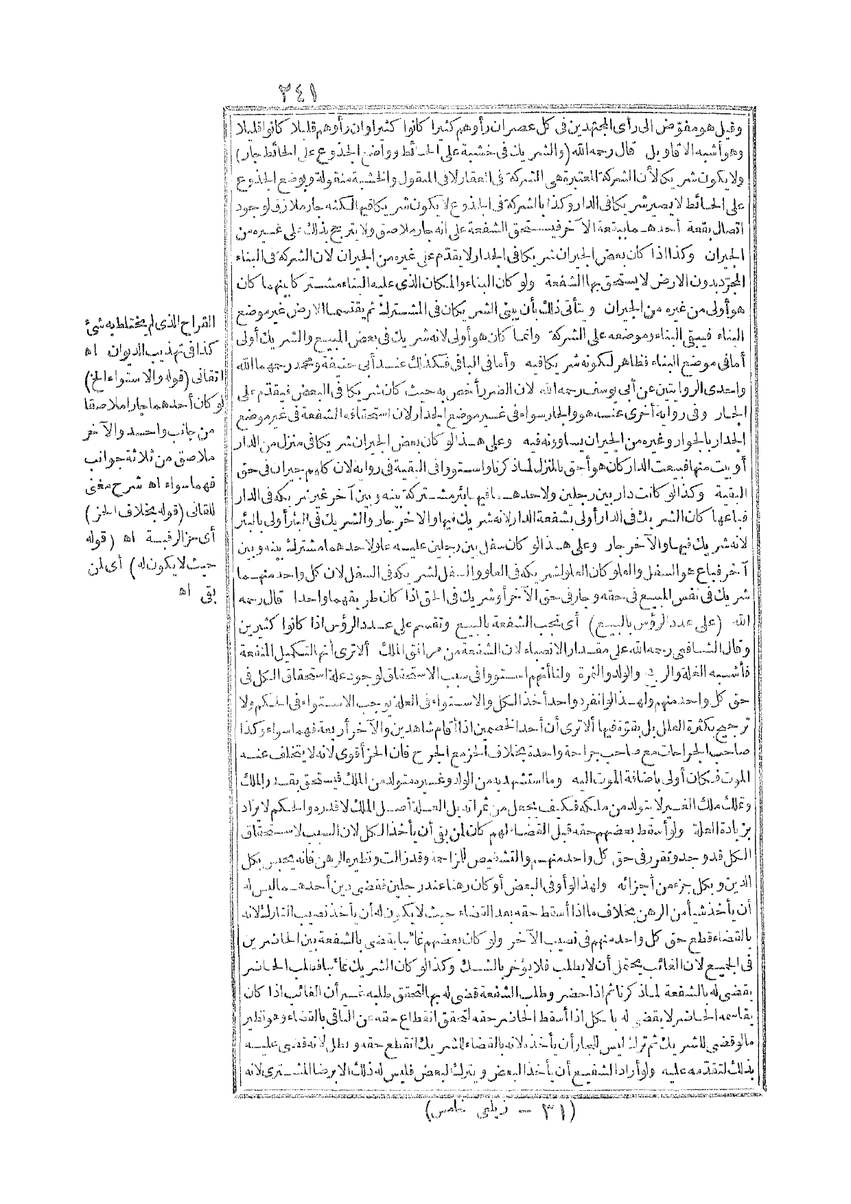 قَالَ - رَحِمَهُ اللَّهُ -: (وَالشَّرِيكُ فِي خَشَبَةٍ عَلَى الْحَائِطِ وَوَاضِعُ الْجُذُوعِ عَلَى الْحَائِطِ جَارٌ)، وَلَا يَكُونُ شَرِيكًا؛ لِأَنَّ الشَّرِكَةَ الْمُعْتَبَرَةَ هِيَ الشَّرِكَةُ فِي الْعَقَارِ لَا فِي الْمَنْقُولِ، وَالْخَشَبَةُ مَنْقُولَةٌ، وَبِوَضْعِ الْجُذُوعِ عَلَى الْحَائِطِ لَا يَصِيرُ شَرِيكًا فِي الدَّارِ، وَكَذَا بِالشَّرِكَةِ فِي الْجُذُوعِ لَا يَكُونُ شَرِيكًا فِيهَا لَكِنَّهُ جَارٌ مُلَازِقٌ لِوُجُودِ اتِّصَالِ بُقْعَةِ أَحَدِهِمَا بِبُقْعَةِ الْآخَرِ فَيَسْتَحِقُّ الشُّفْعَةَ عَلَى أَنَّهُ جَارٌ مُلَاصِقٌ، وَلَا يَتَرَجَّحُ بِذَلِكَ عَلَى غَيْرِهِ مِنْ الْجِيرَانِ، وَكَذَا إذَا كَانَ بَعْضُ الْجِيرَانِ شَرِيكًا فِي الْجِدَارِ لَا يُقَدَّمُ عَلَى غَيْرِهِ مِنْ الْجِيرَانِ؛ لِأَنَّ الشَّرِكَةَ فِي الْبِنَاءِ الْمُجَرَّدِ بِدُونِ الْأَرْضِ لَا يَسْتَحِقُّ بِهَا الشُّفْعَةَ، وَلَوْ كَانَ الْبِنَاءُ، وَالْمَكَانُ الَّذِي عَلَيْهِ الْبِنَاءُ مُشْتَرَكًا بَيْنَهُمَا كَانَ هُوَ أَوْلَى مِنْ غَيْرِهِ مِنْ الْجِيرَانِ وَيَتَأَتَّى ذَلِكَ بِأَنْ يَبْنِيَ الشَّرِيكَانِ فِي الْمُشْتَرَكِ ثُمَّ يَقْتَسِمَا الْأَرْضَ غَيْرَ مَوْضِعِ الْبِنَاءِ فَيَبْقَى الْبِنَاءُ، وَمَوْضِعُهُ عَلَى الشَّرِكَةِ، وَإِنَّمَا كَانَ هُوَ أَوْلَى؛ لِأَنَّهُ شَرِيكٌ فِي بَعْضِ الْمَبِيعِ وَالشَّرِيكُ أَوْلَى أَمَّا فِي مَوْضِعِ الْبِنَاءِ فَظَاهِرٌ لِكَوْنِهِ شَرِيكًا فِيهِ، وَأَمَّا فِي الْبَاقِي فَكَذَلِكَ عِنْدَ أَبِي حَنِيفَةَ وَمُحَمَّدٍ رَحِمَهُمَا اللَّهُ، وَإِحْدَى الرِّوَايَتَيْنِ عَنْ أَبِي يُوسُفَ - رَحِمَهُ اللَّهُ -؛ لِأَنَّ الضَّرَرَ أَخَصُّ بِهِ حَيْثُ كَانَ شَرِيكًا فِي الْبَعْضِ فَيُقَدَّمُ عَلَى الْجَارِ، وَفِي رِوَايَةٍ أُخْرَى عَنْهُ هُوَ وَالْجَارُ سَوَاءٌ فِي غَيْرِ مَوْضِعِ الْجِدَارِ؛ لِأَنَّ اسْتِحْقَاقَهُ الشُّفْعَةَ فِي غَيْرِ مَوْضِعِ الْجِدَارِ بِالْجِوَارِ وَغَيْرِهِ مِنْ الْجِيرَانِ يُسَاوُونَهُ فِيهِ، وَعَلَى هَذَا لَوْ كَانَ بَعْضُ الْجِيرَانِ شَرِيكًا فِي مَنْزِلٍ مِنْ الدَّارِ أَوْ بَيْتٍ مِنْهَا فَبِيعَتْ الدَّارُ كَانَ هُوَ أَحَقَّ بِالْمَنْزِلِ لِمَا ذَكَرْنَا وَاسْتَوَوْا فِي الْبَقِيَّةِ فِي رِوَايَةٍ؛ لِأَنَّ كُلَّهُمْ جِيرَانٌ فِي حَقِّ الْبَقِيَّةِ.