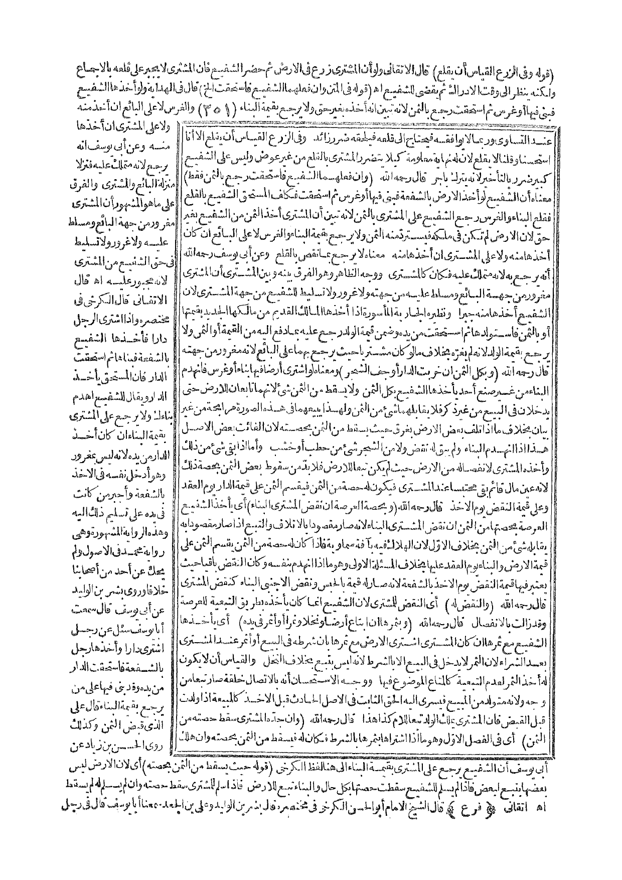 قَالَ - رَحِمَهُ اللَّهُ -: (وَبِكُلِّ الثَّمَنِ إنْ خَرِبَتْ الدَّارُ أَوْ جَفَّ الشَّجَرُ)، وَمَعْنَاهُ لَوْ اشْتَرَى أَرْضًا فِيهَا بِنَاءٌ أَوْ غَرْسٌ فَانْهَدَمَ الْبِنَاءُ مِنْ غَيْرِ صُنْعِ أَحَدٍ يَأْخُذُهَا الشَّفِيعُ بِكُلِّ الثَّمَنِ، وَلَا يَسْقُطُ مِنْ الثَّمَنِ شَيْءٌ؛ لِأَنَّهُمَا تَابِعَانِ لِلْأَرْضِ حَتَّى يَدْخُلَانِ فِي الْبَيْعِ مِنْ غَيْرِ ذِكْرٍ فَلَا يُقَابِلُهُمَا شَيْءٌ مِنْ الثَّمَنِ وَلِهَذَا يَبِيعُهُمَا فِي هَذِهِ الصُّورَةِ مُرَابَحَةً مِنْ غَيْرِ بَيَانٍ بِخِلَافِ مَا إذَا تَلِفَ بَعْضُ الْأَرْضِ بِغَرَقٍ حَيْثُ يَسْقُطُ مِنْ الثَّمَنِ بِحِصَّتِهِ؛ لِأَنَّ الْفَائِتَ بَعْضُ الْأَصْلِ هَذَا إذَا انْهَدَمَ الْبِنَاءُ، وَلَمْ يَبْقَ لَهُ نَقْضٌ، وَلَا مِنْ الشَّجَرِ شَيْءٌ مِنْ حَطَبٍ أَوْ خَشَبٍ، وَأَمَّا إذَا بَقِيَ شَيْءٌ مِنْ ذَلِكَ، وَأَخَذَهُ الْمُشْتَرِي لِانْفِصَالِهِ مِنْ الْأَرْضِ حَيْثُ لَمْ يَكُنْ تَبَعًا لِلْأَرْضِ فَلَا بُدَّ مِنْ سُقُوطِ بَعْضِ الثَّمَنِ بِحِصَّةِ ذَلِكَ؛ لِأَنَّهُ عَيْنُ مَالٍ قَائِمٍ بَقِيَ مُحْتَبِسًا عِنْدَ الْمُشْتَرِي فَيَكُونُ لَهُ حِصَّةٌ مِنْ الثَّمَنِ فَيُقْسَمُ الثَّمَنُ عَلَى قِيمَةِ الدَّارِ يَوْمَ الْعَقْدِ، وَعَلَى قِيمَةِ النَّقْضِ يَوْمَ الْأَخْذِ.
