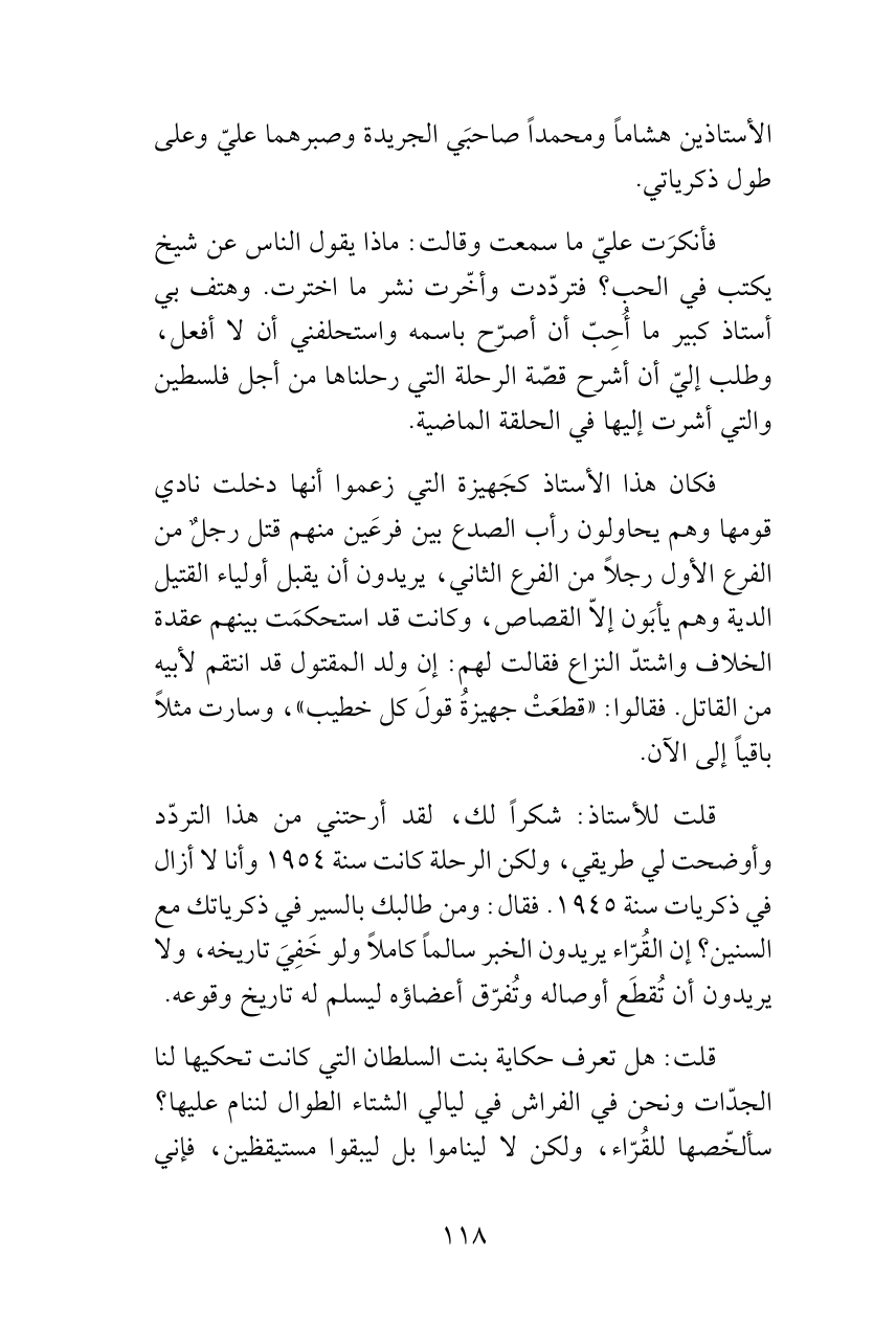 قلت للأستاذ: شكراً لك، لقد أرحتني من هذا التردّد وأوضحت لي طريقي، ولكن الرحلة كانت سنة 1954 وأنا لا أزال في ذكريات سنة 1945. فقال: ومن طالبك بالسير في ذكرياتك مع السنين؟ إن القُرّاء يريدون الخبر سالماً كاملاً ولو خَفِيَ تاريخه، ولا يريدون أن تُقطَع أوصاله وتُفرّق أعضاؤه ليسلم له تاريخ وقوعه.