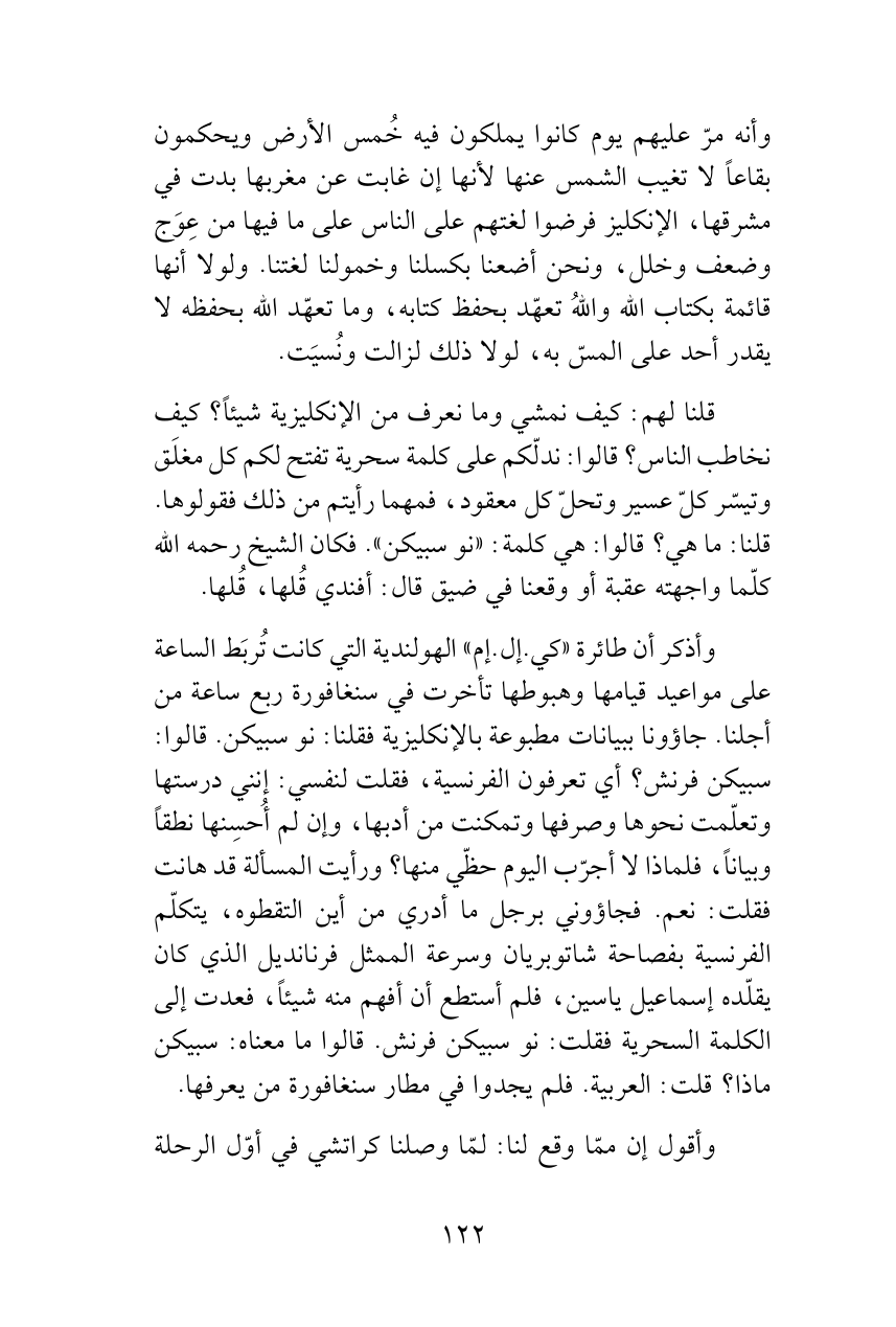 قلنا لهم: كيف نمشي وما نعرف من الإنكليزية شيئاً؟ كيف نخاطب الناس؟ قالوا: ندلّكم على كلمة سحرية تفتح لكم كل مغلَق وتيسّر كلّ عسير وتحلّ كل معقود، فمهما رأيتم من ذلك فقولوها. قلنا: ما هي؟ قالوا: هي كلمة: «نو سبيكن». فكان الشيخ رحمه الله كلّما واجهته عقبة أو وقعنا في ضيق قال: أفندي قُلها، قُلها.