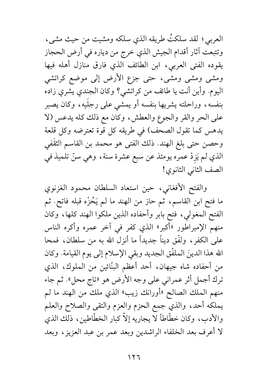 العربي؛ لقد سلكتُ طريقه الذي سلكه ومشيت من حيث مشى، وتتبعت آثار أقدام الجيش الذي خرج من دياره في أرض الحجاز يقوده الفتى العربي، ابن الطائف الذي فارق منازل أهله فيها ومشى ومشى ومشى، حتى جزع الأرض إلى موضع كراتشي اليوم. وأين أنت يا طائف من كراتشي؟ وكان الجندي يشري زاده بنفسه، وراحلته يشريها بنفسه أو يمشي على رجلَيه، وكان يصبر على الحر والقر والجوع والعطش، وكان مع ذلك كله يدعس (لا يدهس كما تقول الصحف) في طريقه كل قوة تعترضه وكل قلعة وحصن حتى بلغ الهند. ذلك الفتى هو محمد بن القاسم الثقَفي الذي لم يَزِدْ عمره يومئذ عن سبع عشرة سنة، وهي سنّ تلميذ في الصف الثاني الثانوي!