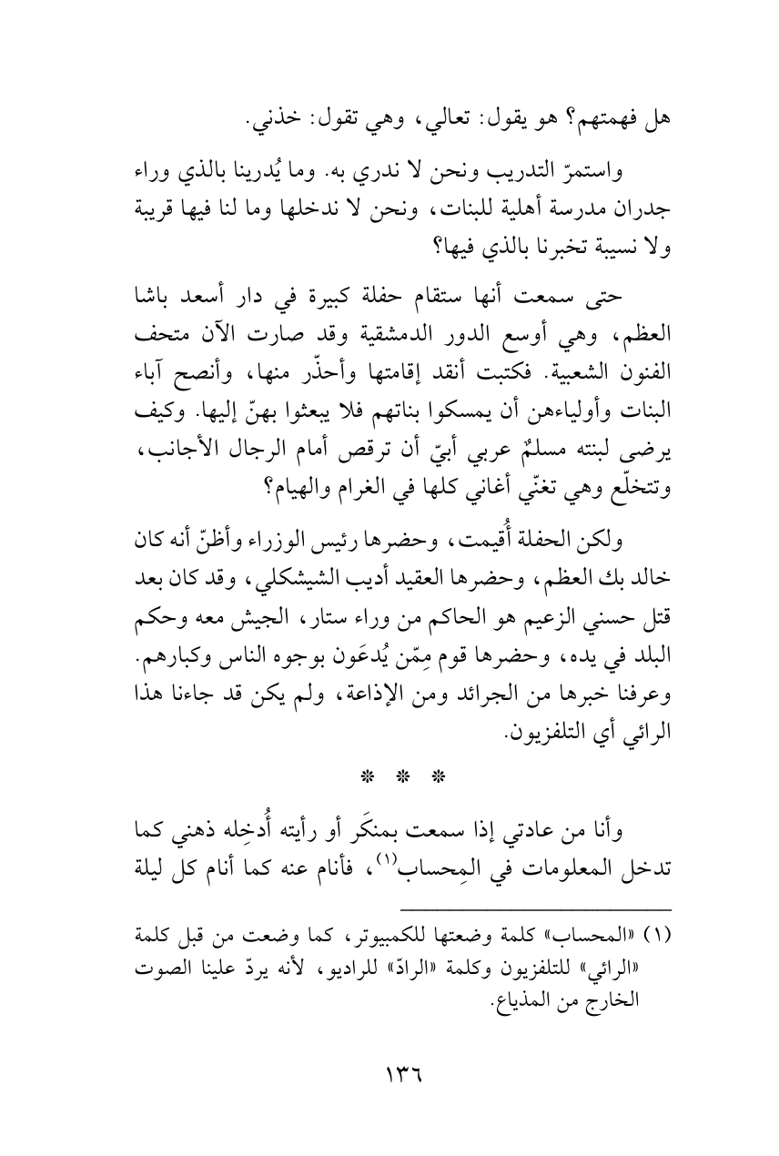 ولكن الحفلة أُقيمت، وحضرها رئيس الوزراء وأظنّ أنه كان خالد بك العظم، وحضرها العقيد أديب الشيشكلي، وقد كان بعد قتل حسني الزعيم هو الحاكم من وراء ستار، الجيش معه وحكم البلد في يده، وحضرها قوم مِمّن يُدعَون بوجوه الناس وكبارهم. وعرفنا خبرها من الجرائد ومن الإذاعة، ولم يكن قد جاءنا هذا الرائي أي التلفزيون.