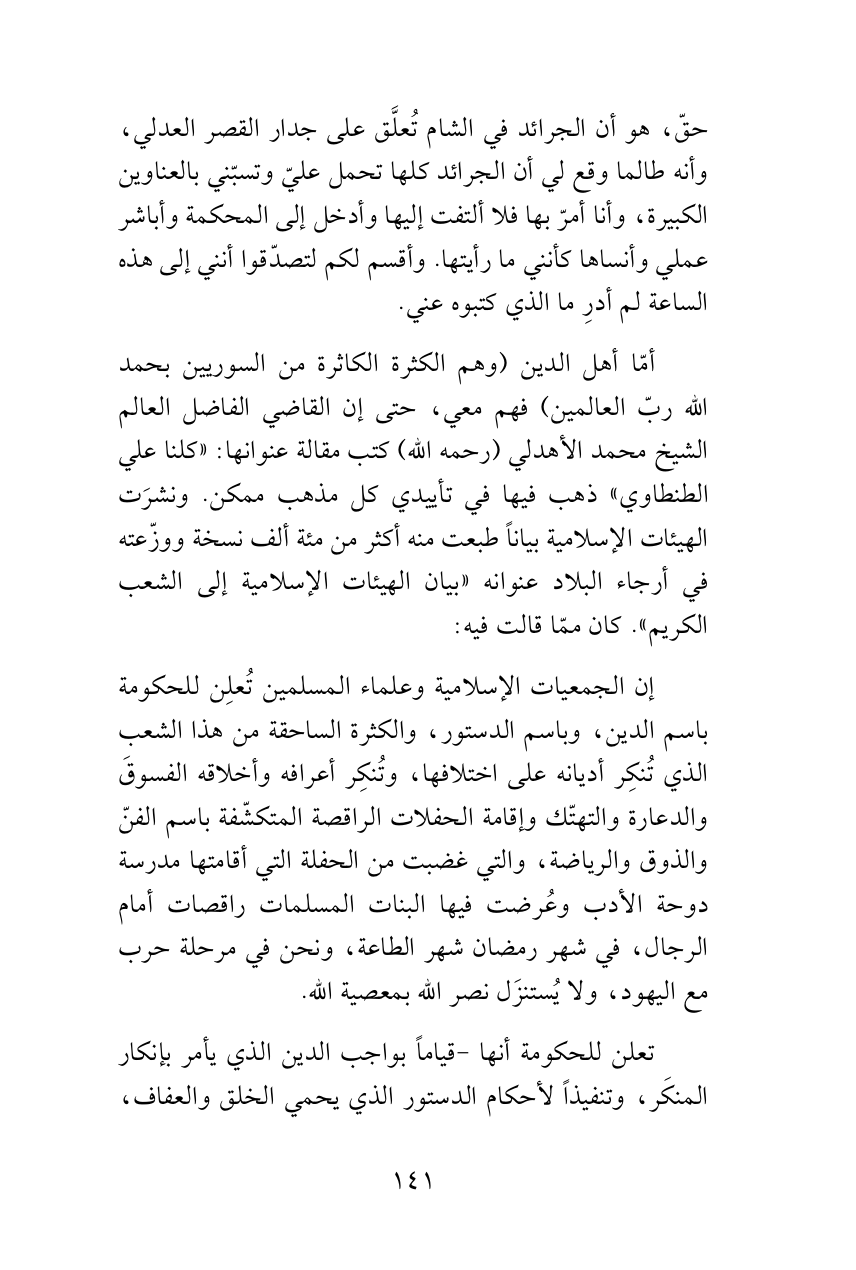 إن الجمعيات الإسلامية وعلماء المسلمين تُعلِن للحكومة باسم الدين، وباسم الدستور، والكثرة الساحقة من هذا الشعب الذي تُنكِر أديانه على اختلافها، وتُنكِر أعرافه وأخلاقه الفسوقَ والدعارة والتهتّك وإقامة الحفلات الراقصة المتكشّفة باسم الفنّ والذوق والرياضة، والتي غضبت من الحفلة التي أقامتها مدرسة دوحة الأدب وعُرضت فيها البنات المسلمات راقصات أمام الرجال، في شهر رمضان شهر الطاعة، ونحن في مرحلة حرب مع اليهود، ولا يُستنزَل نصر الله بمعصية الله.