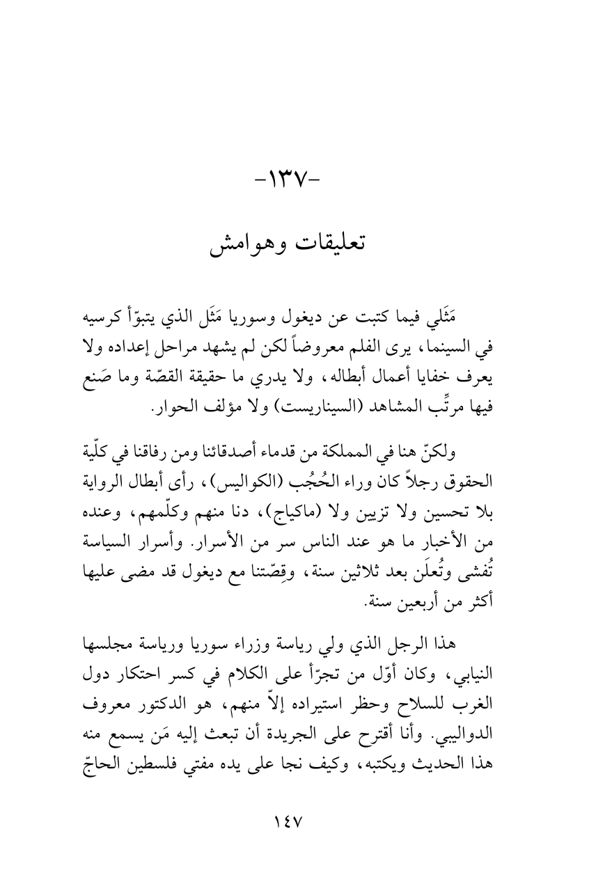 ولكنّ هنا في المملكة من قدماء أصدقائنا ومن رفاقنا في كلّية الحقوق رجلاً كان وراء الحُجُب (الكواليس)، رأى أبطال الرواية بلا تحسين ولا تزيين ولا (ماكياج)، دنا منهم وكلّمهم، وعنده من الأخبار ما هو عند الناس سر من الأسرار. وأسرار السياسة تُفشى وتُعلَن بعد ثلاثين سنة، وقِصّتنا مع ديغول قد مضى عليها أكثر من أربعين سنة.