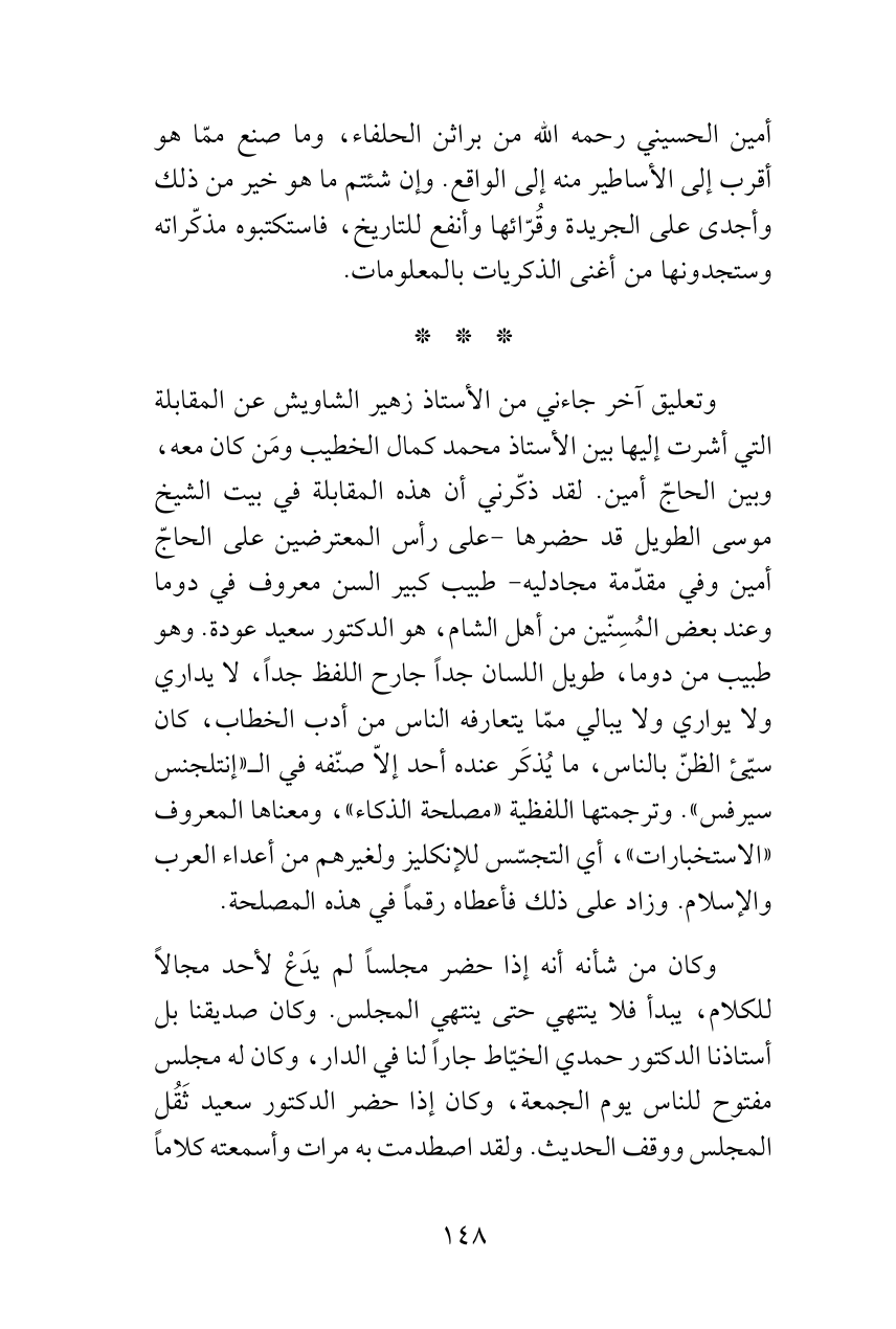 وتعليق آخر جاءني من الأستاذ زهير الشاويش عن المقابلة التي أشرت إليها بين الأستاذ محمد كمال الخطيب ومَن كان معه، وبين الحاجّ أمين. لقد ذكّرني أن هذه المقابلة في بيت الشيخ موسى الطويل قد حضرها -على رأس المعترضين على الحاجّ أمين وفي مقدّمة مجادليه- طبيب كبير السن معروف في دوما وعند بعض المُسِنّين من أهل الشام، هو الدكتور سعيد عودة. وهو طبيب من دوما، طويل اللسان جداً جارح اللفظ جداً، لا يداري ولا يواري ولا يبالي ممّا يتعارفه الناس من أدب الخطاب، كان سيّئ الظنّ بالناس، ما يُذكَر عنده أحد إلاّ صنّفه في الـ «إنتلجنس سيرفس». وترجمتها اللفظية «مصلحة الذكاء»، ومعناها المعروف «الاستخبارات»، أي التجسّس للإنكليز ولغيرهم من أعداء العرب والإسلام. وزاد على ذلك فأعطاه رقماً في هذه المصلحة.