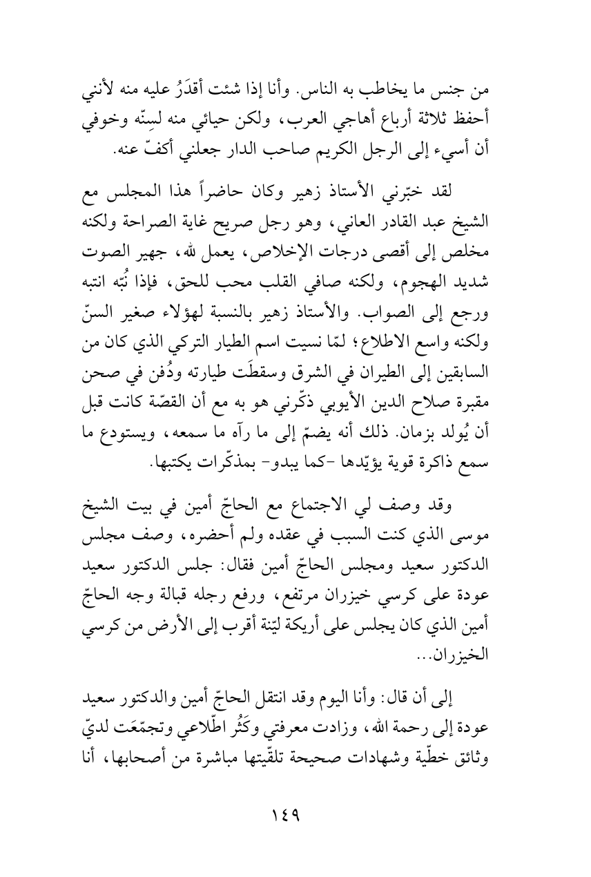 لقد خبّرني الأستاذ زهير وكان حاضراً هذا المجلس مع الشيخ عبد القادر العاني، وهو رجل صريح غاية الصراحة ولكنه مخلص إلى أقصى درجات الإخلاص، يعمل لله، جهير الصوت شديد الهجوم، ولكنه صافي القلب محب للحق، فإذا نُبّه انتبه ورجع إلى الصواب. والأستاذ زهير بالنسبة لهؤلاء صغير السنّ ولكنه واسع الاطلاع؛ لمّا نسيت اسم الطيار التركي الذي كان من السابقين إلى الطيران في الشرق وسقطَت طيارته ودُفن في صحن مقبرة صلاح الدين الأيوبي ذكّرني هو به مع أن القصّة كانت قبل أن يُولد بزمان. ذلك أنه يضمّ إلى ما رآه ما سمعه، ويستودع ما سمع ذاكرة قوية يؤيّدها -كما يبدو- بمذكّرات يكتبها.
