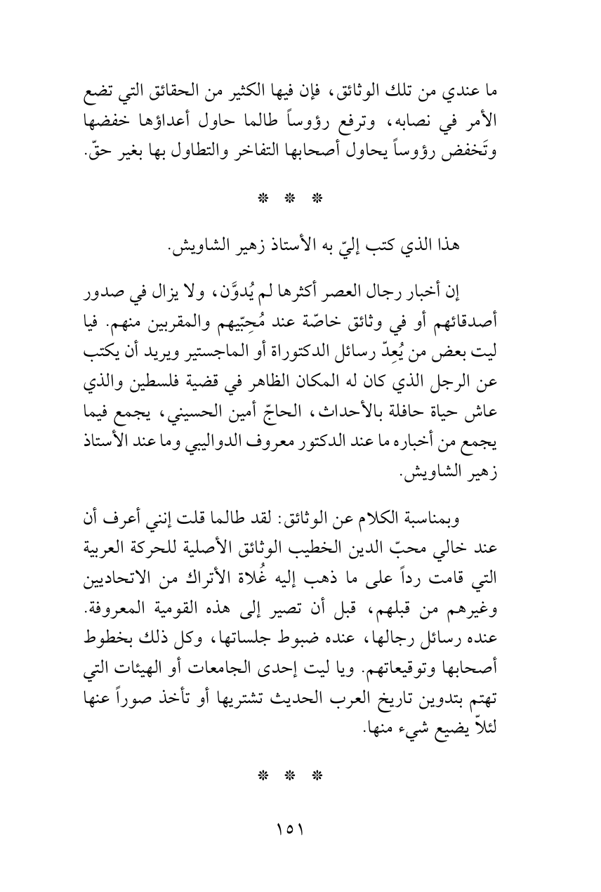 إن أخبار رجال العصر أكثرها لم يُدوَّن، ولا يزال في صدور أصدقائهم أو في وثائق خاصّة عند مُحِبّيهم والمقربين منهم. فيا ليت بعض من يُعِدّ رسائل الدكتوراة أو الماجستير ويريد أن يكتب عن الرجل الذي كان له المكان الظاهر في قضية فلسطين والذي عاش حياة حافلة بالأحداث، الحاجّ أمين الحسيني، يجمع فيما يجمع من أخباره ما عند الدكتور معروف الدواليبي وما عند الأستاذ زهير الشاويش.