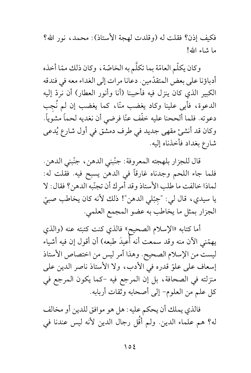 أما كتابه «الإسلام الصحيح» فالذي كنت كتبته عنه (والذي يهمّني الآن منه وقد سمعت أنه أُعيدَ طبعه) أن أقول إن فيه أشياء ليست من الإسلام الصحيح. وهذا أمر ليس من اختصاص الأستاذ إسعاف على علوّ قدره في الأدب، ولا الأستاذ ناصر الدين على منزلته في الصحافة، بل إن المرجع فيه -كما يكون المرجع في كل علم من العلوم- إلى أصحابه وثقات أربابه.