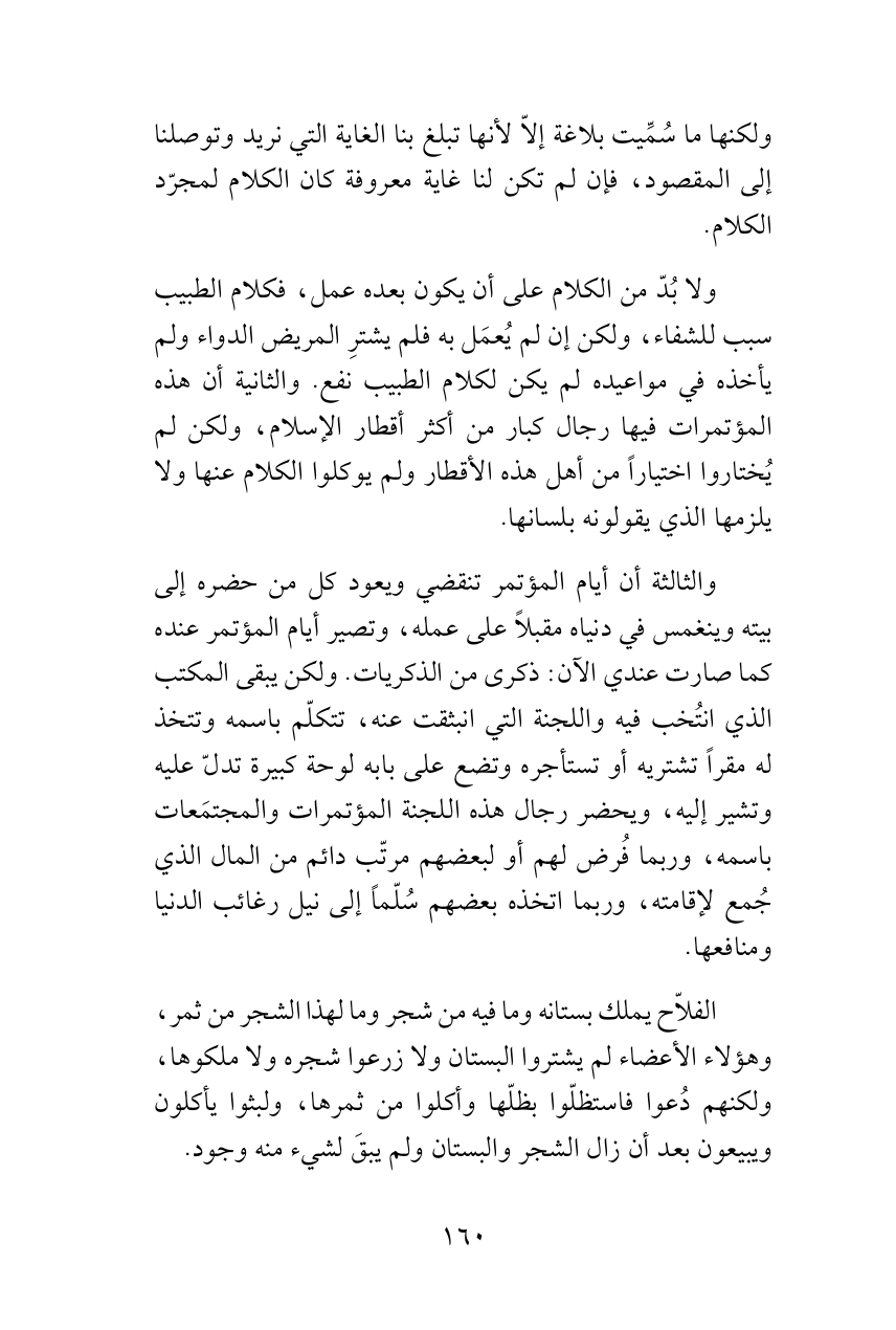 والثالثة أن أيام المؤتمر تنقضي ويعود كل من حضره إلى بيته وينغمس في دنياه مقبلاً على عمله، وتصير أيام المؤتمر عنده كما صارت عندي الآن: ذكرى من الذكريات. ولكن يبقى المكتب الذي انتُخب فيه واللجنة التي انبثقت عنه، تتكلّم باسمه وتتخذ له مقراً تشتريه أو تستأجره وتضع على بابه لوحة كبيرة تدلّ عليه وتشير إليه، ويحضر رجال هذه اللجنة المؤتمرات والمجتمَعات باسمه، وربما فُرض لهم أو لبعضهم مرتّب دائم من المال الذي جُمع لإقامته، وربما اتخذه بعضهم سُلّماً إلى نيل رغائب الدنيا ومنافعها.