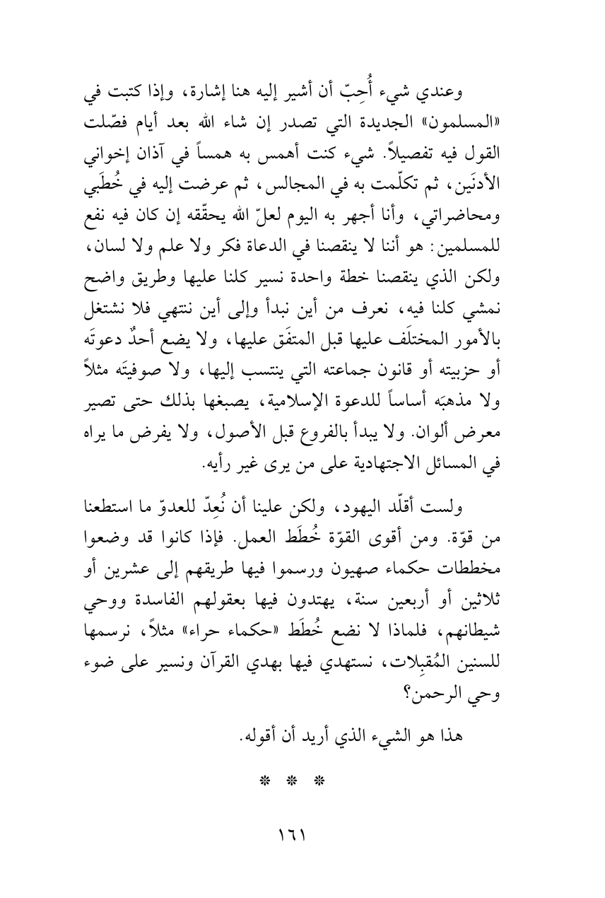 وعندي شيء أُحِبّ أن أشير إليه هنا إشارة، وإذا كتبت في «المسلمون» الجديدة التي تصدر إن شاء الله بعد أيام فصّلت القول فيه تفصيلاً. شيء كنت أهمس به همساً في آذان إخواني الأدنَين، ثم تكلّمت به في المجالس، ثم عرضت إليه في خُطَبي ومحاضراتي، وأنا أجهر به اليوم لعلّ الله يحقّقه إن كان فيه نفع للمسلمين: هو أننا لا ينقصنا في الدعاة فكر ولا علم ولا لسان، ولكن الذي ينقصنا خطة واحدة نسير كلنا عليها وطريق واضح نمشي كلنا فيه، نعرف من أين نبدأ وإلى أين ننتهي فلا نشتغل بالأمور المختلَف عليها قبل المتفَق عليها، ولا يضع أحدٌ دعوتَه أو حزبيته أو قانون جماعته التي ينتسب إليها، ولا صوفيتَه مثلاً ولا مذهبَه أساساً للدعوة الإسلامية، يصبغها بذلك حتى تصير معرض ألوان. ولا يبدأ بالفروع قبل الأصول، ولا يفرض ما يراه في المسائل الاجتهادية على من يرى غير رأيه.