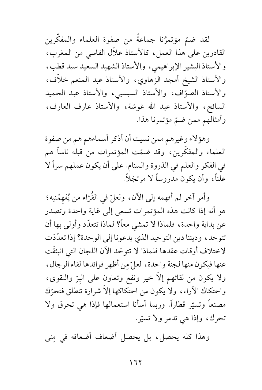 وأمر آخر لم أفهمه إلى الآن، ولعلّ في القُرّاء من يُفهِمُنيه؛ هو أنه إذا كانت هذه المؤتمرات تسعى إلى غاية واحدة وتصدر عن بداية واحدة، فلماذا لا تمشي معاً؟ لماذا تتعدّد وأولى بها أن تتوحد، وديننا دين التوحيد الذي يدعونا إلى الوحدة؟ إذا تعدّدَت لاختلاف أوقات عقدها فلماذا لا تتوحّد الآن اللجان التي انبثقَت عنها فيكون منها لجنة واحدة، لعلّ مِن أظهر فوائدها لقاء الرجال، ولا يكون من لقائهم إلاّ خير ونفع وتعاون على البِرّ والتقوى، واحتكاك الآراء، ولا يكون من احتكاكها إلاّ شرارة تنطلق فتحرّك مصنعاً وتسيّر قطاراً. وربما أسأنا استعمالها فإذا هي تحرق ولا تحرك، وإذا هي تدمر ولا تسيّر.