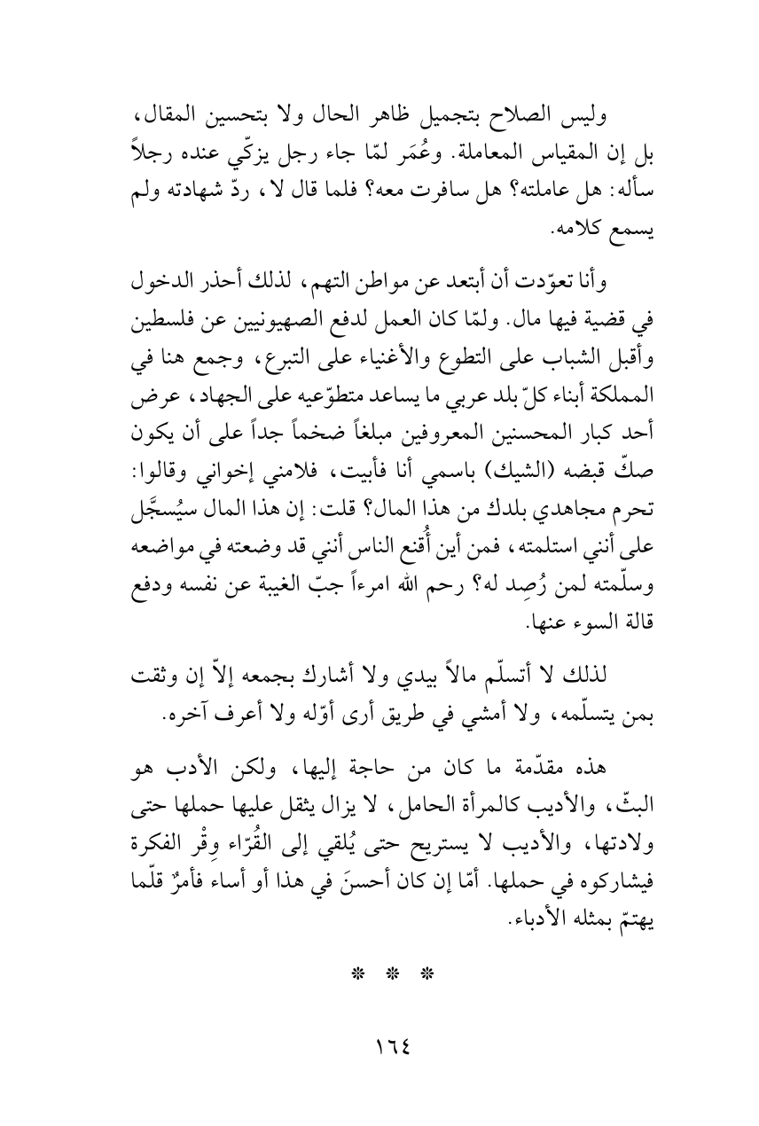 لذلك لا أتسلّم مالاً بيدي ولا أشارك بجمعه إلاّ إن وثقت بمن يتسلّمه، ولا أمشي في طريق أرى أوّله ولا أعرف آخره.