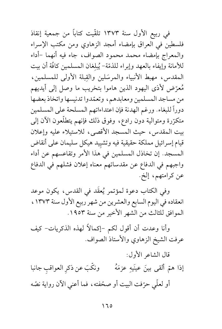 في ربيع الأول سنة 1373 تلقّيت كتاباً من جمعية إنقاذ فلسطين في العراق بإمضاء أمجد الزهاوي ومن مكتب الإسراء والمعراج بإمضاء محمد محمود الصواف، جاء فيه أنهما -أداء للأمانة وإيفاء بالعهد وإبراء للذمّة- يُبلِغان المسلمين كافّة أن بيت المقدس، مهبط الأنبياء والمرسَلين والقِبلة الأولى للمسلمين، مُعرّض لأذى اليهود الذين هاموا بتخريب ما وصل إلى أيديهم من مساجد المسلمين ومعابدهم، وتعمّدوا تدنيسها واتخاذ بعضها دوراً للبغاء. ورغم الهدنة فإن اعتداءاتهم المسلحة على المسلمين متكرّرة ومتوالية دون رادع، وفوق ذلك فإنهم يتطلّعون الآن إلى بيت المقدس، حيث المسجد الأقصى، للاستيلاء عليه وإعلان قيام إسرائيل مملكة حقيقية فيه وتشيِيد هيكل سليمان على أنقاض المسجد. إن تخاذل المسلمين في هذا الأمر وتقاعسهم عن أداء واجبهم في الدفاع عن مقدساتهم معناه إعلان فشلهم في الدفاع عن كرامتهم، إلخ.
