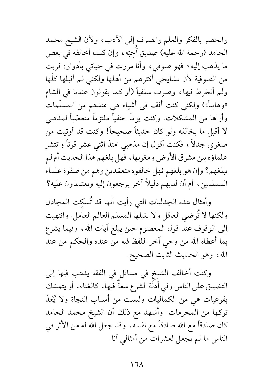 وانحصر بالفكر والعلم وانصرف إلى الأدب، ولأن الشيخ محمد الحامد (رحمة الله عليه) صديق أُحِبّه، وإن كنت أخالفه في بعض ما يذهب إليه؛ فهو صوفي، وأنا مررت في حياتي بأدوار: قربت من الصوفية لأن مشايخي أكثرهم من أهلها ولكني لم أقبلها كلّها ولم أنخرط فيها، وصرت سلفياً (أو كما يقولون عندنا في الشام «وهابياً») ولكني كنت أقف في أشياء هي عندهم من المسلّمات وأراها من المشكلات. وكنت يوماً حنفياً ملتزماً متعصّباً لمذهبي لا أقبل ما يخالفه ولو كان حديثاً صحيحاً! وكنت قد أوتيت من صغري جدلاً، فكنت أقول إن مذهبي امتدّ اثني عشر قرناً وانتشر علماؤه بين مشرق الأرض ومغربها، فهل بلغهم هذا الحديث أم لم يبلغهم؟ وإن هو بلغهم فهل خالفوه متعمّدين وهم من صفوة علماء المسلمين، أم أن لديهم دليلاً آخر يرجعون إليه ويعتمدون عليه؟