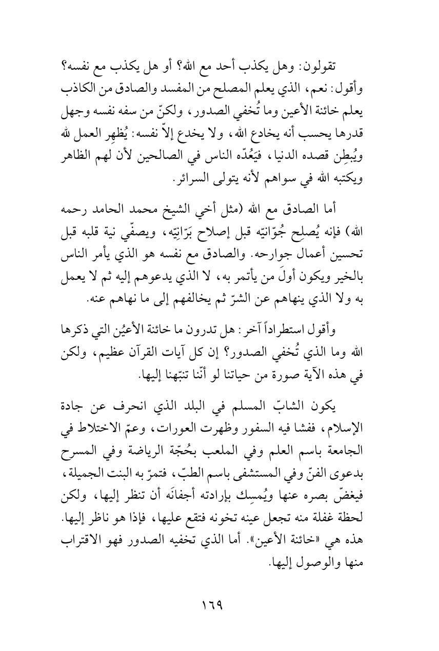 تقولون: وهل يكذب أحد مع الله؟ أو هل يكذب مع نفسه؟ وأقول: نعم، الذي يعلم المصلح من المفسد والصادق من الكاذب يعلم خائنة الأعين وما تُخفي الصدور، ولكنّ من سفه نفسه وجهل قدرها يحسب أنه يخادع الله، ولا يخدع إلاّ نفسه: يُظهِر العمل لله ويُبطِن قصده الدنيا، فيَعُدّه الناس في الصالحين لأن لهم الظاهر ويكتبه الله في سواهم لأنه يتولى السرائر.