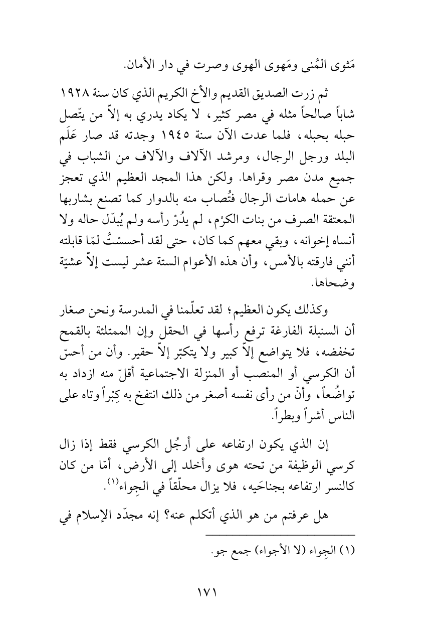 ثم زرت الصديق القديم والأخ الكريم الذي كان سنة 1928 شاباً صالحاً مثله في مصر كثير، لا يكاد يدري به إلاّ من يتّصل حبله بحبله، فلما عدت الآن سنة 1945 وجدته قد صار عَلَم البلد ورجل الرجال، ومرشد الآلاف والآلاف من الشباب في جميع مدن مصر وقراها. ولكن هذا المجد العظيم الذي تعجز عن حمله هامات الرجال فتُصاب منه بالدوار كما تصنع بشاربها المعتقة الصرف من بنات الكرْم، لم يدُرْ رأسه ولم يُبدّل حاله ولا أنساه إخوانه، وبقي معهم كما كان، حتى لقد أحسسْتُ لمّا قابلته أنني فارقته بالأمس، وأن هذه الأعوام الستة عشر ليست إلاّ عشيّة وضحاها.