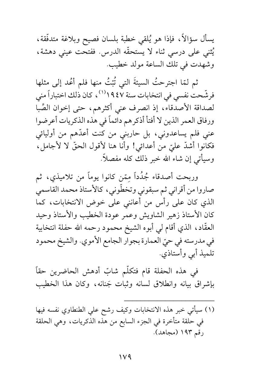 (¬1) سيأتي خبر هذه الانتخابات وكيف رشح علي الطنطاوي نفسه فيها في حلقة متأخرة في الجزء السابع من هذه الذكريات، وهي الحلقة رقم 193 (مجاهد).