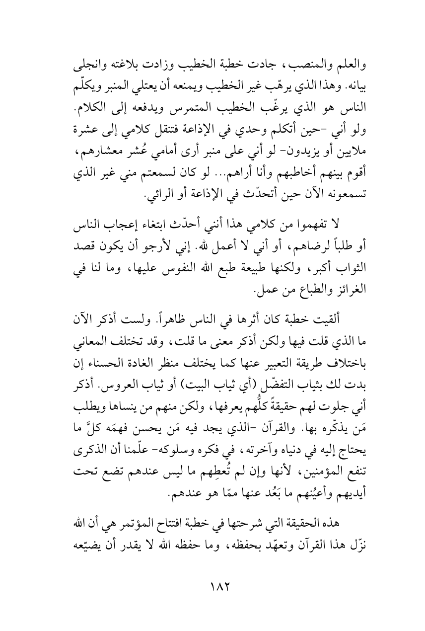 والعلم والمنصب، جادت خطبة الخطيب وزادت بلاغته وانجلى بيانه. وهذا الذي يرهّب غير الخطيب ويمنعه أن يعتلي المنبر ويكلّم الناس هو الذي يرغّب الخطيب المتمرس ويدفعه إلى الكلام. ولو أني -حين أتكلم وحدي في الإذاعة فتنقل كلامي إلى عشرة ملايين أو يزيدون- لو أني على منبر أرى أمامي عُشر معشارهم، أقوم بينهم أخاطبهم وأنا أراهم ... لو كان لسمعتم مني غير الذي تسمعونه الآن حين أتحدّث في الإذاعة أو الرائي.