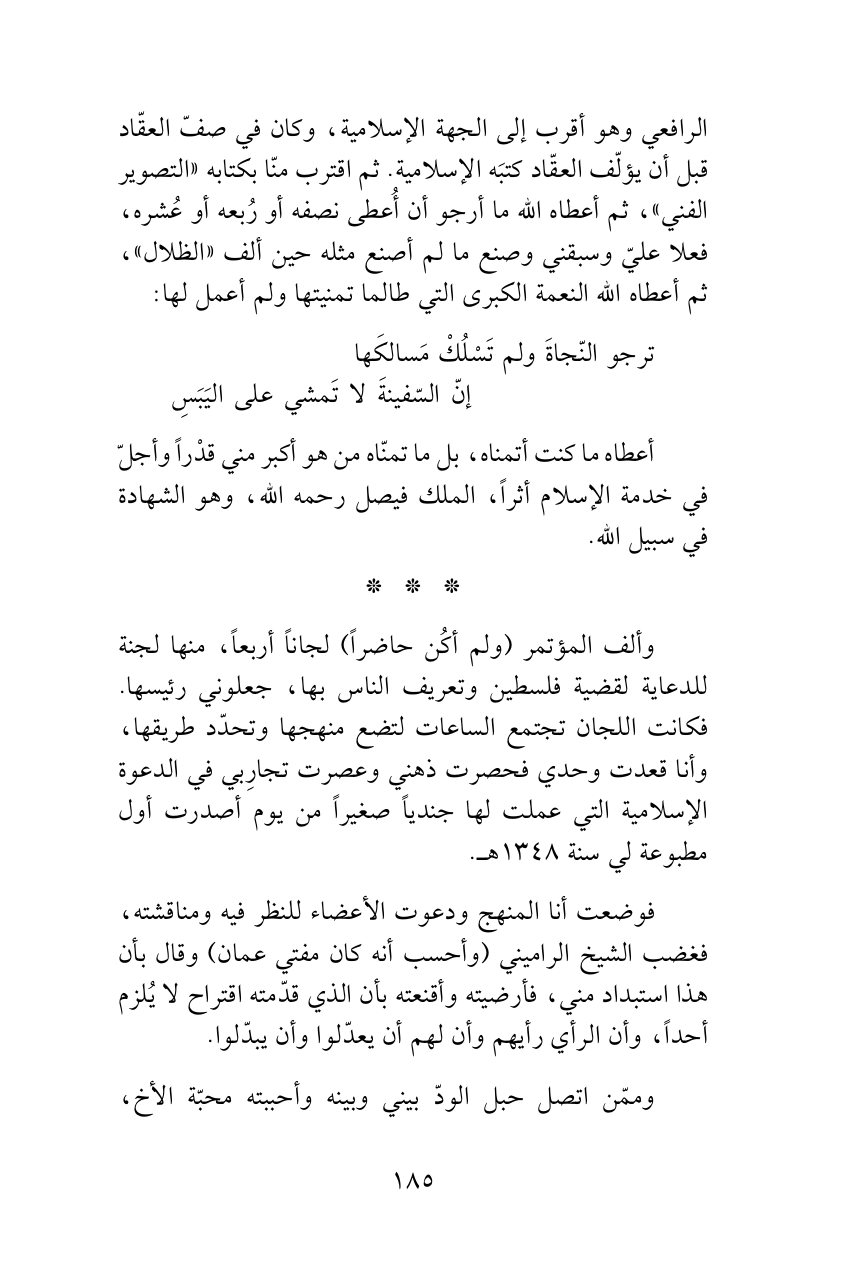 الرافعي وهو أقرب إلى الجهة الإسلامية، وكان في صفّ العقّاد قبل أن يؤلّف العقّاد كتبَه الإسلامية. ثم اقترب منّا بكتابه «التصوير الفني»، ثم أعطاه الله ما أرجو أن أُعطى نصفه أو رُبعه أو عُشره، فعلا عليّ وسبقني وصنع ما لم أصنع مثله حين ألف «الظلال»، ثم أعطاه الله النعمة الكبرى التي طالما تمنيتها ولم أعمل لها: