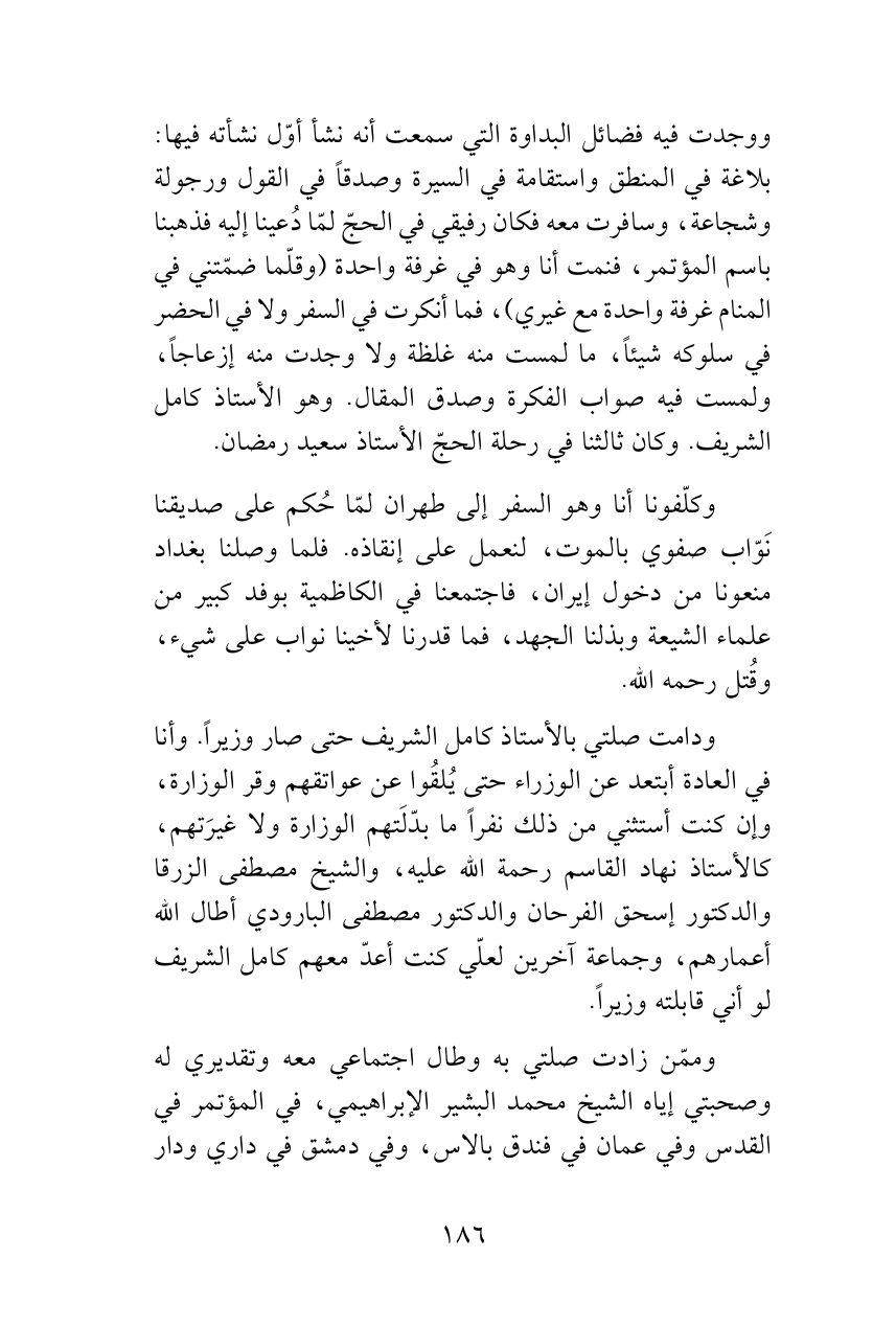 ووجدت فيه فضائل البداوة التي سمعت أنه نشأ أوّل نشأته فيها: بلاغة في المنطق واستقامة في السيرة وصدقاً في القول ورجولة وشجاعة، وسافرت معه فكان رفيقي في الحجّ لمّا دُعينا إليه فذهبنا باسم المؤتمر، فنمت أنا وهو في غرفة واحدة (وقلّما ضمّتني في المنام غرفة واحدة مع غيري)، فما أنكرت في السفر ولا في الحضر في سلوكه شيئاً، ما لمست منه غلظة ولا وجدت منه إزعاجاً، ولمست فيه صواب الفكرة وصدق المقال. وهو الأستاذ كامل الشريف. وكان ثالثنا في رحلة الحجّ الأستاذ سعيد رمضان.