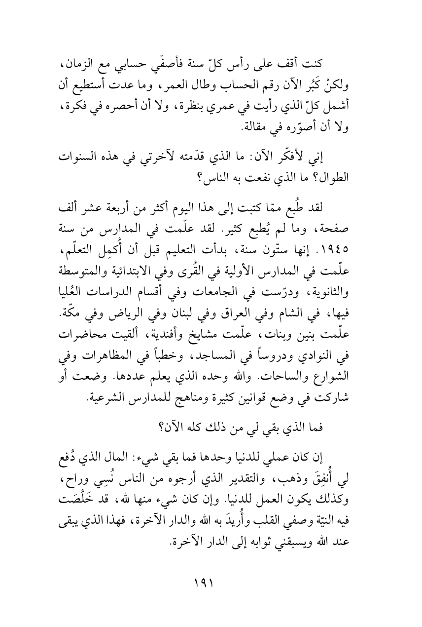 إني لأفكّر الآن: ما الذي قدّمته لآخرتي في هذه السنوات الطوال؟ ما الذي نفعت به الناس؟