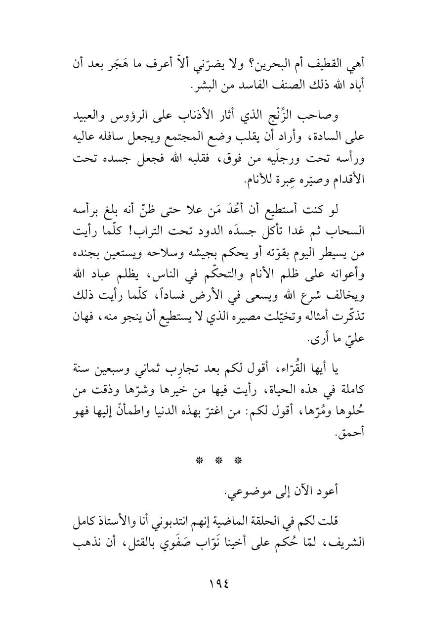 يا أيها القُرّاء، أقول لكم بعد تجارِب ثماني وسبعين سنة كاملة في هذه الحياة، رأيت فيها من خيرها وشرّها وذقت من حُلوها ومُرّها، أقول لكم: من اغترّ بهذه الدنيا واطمأنّ إليها فهو أحمق.