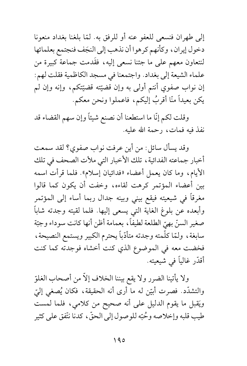 إلى طهران فنسعى للعفو عنه أو للرفق به. لمّا بلغنا بغداد منعونا دخول إيران، وكأنهم كرهوا أن نذهب إلى النجَف فنجتمع بعلمائها لنتعاون معهم على ما جئنا نسعى إليه، فقَدمت جماعة كبيرة من علماء الشيعة إلى بغداد. واجتمعنا في مسجد الكاظمية فقلت لهم: إن نواب صفوي أنتم أولى به وإن قضيّته قضيّتكم، وإنه وإن لم يكن بعيداً منّا أقربُ إليكم، فاعملوا ونحن معكم.