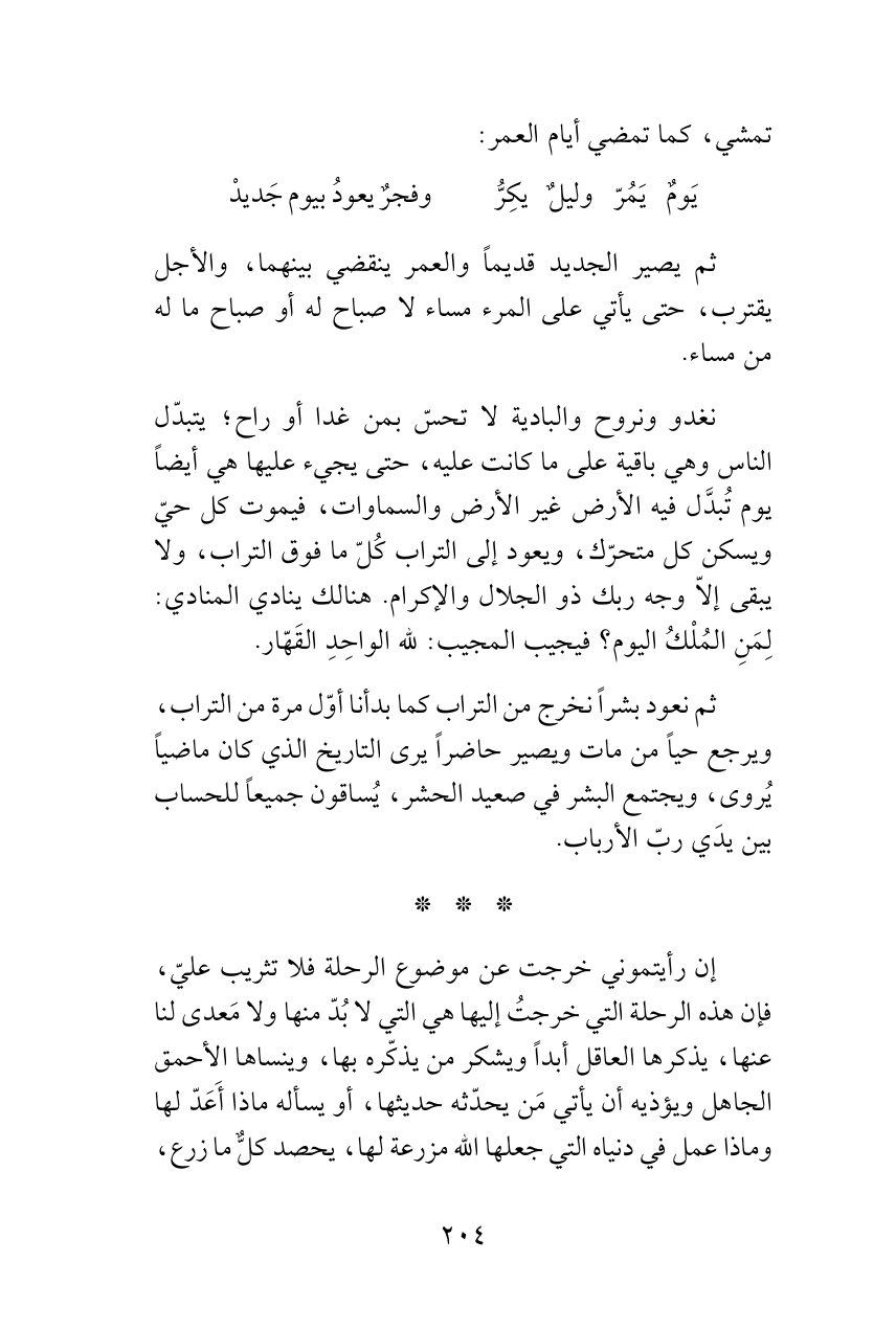 إن رأيتموني خرجت عن موضوع الرحلة فلا تثريب عليّ، فإن هذه الرحلة التي خرجتُ إليها هي التي لا بُدّ منها ولا مَعدى لنا عنها، يذكرها العاقل أبداً ويشكر من يذكّره بها، وينساها الأحمق الجاهل ويؤذيه أن يأتي مَن يحدّثه حديثها، أو يسأله ماذا أَعَدّ لها وماذا عمل في دنياه التي جعلها الله مزرعة لها، يحصد كلٌّ ما زرع،