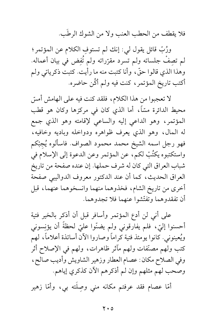 لا تعجبوا من هذا الكلام، فلقد كنت فيه على الهامش أمسّ محيط الدائرة مسّاً، أما الذي كان في مركزها وكان هو قطب المؤتمر، وهو الداعي إليه والساعي لإقامته وهو الذي جمع له المال، وهو الذي يعرف ظواهره ودواخله وباديه وخافيه، فهو رجل اسمه الشيخ محمد محمود الصواف. فاسألوه يُجِبْكم واستكتبوه يكتُبْ لكم، عن المؤتمر وعن الدعوة إلى الإسلام في شباب العراق التي كان له شرف حملها. إن عنده صفحة من تاريخ العراق الحديث، كما أن عند الدكتور معروف الدواليبي صفحة أخرى من تاريخ الشام، فخذوهما منهما وانسخوهما عنهما، قبل أن تفقدوهما وتفتّشوا عنهما فلا تجدوهما.