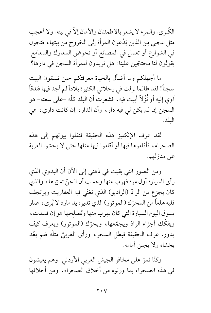 الكُبرى. والمرء لا يشعر بالاطمئنان والأمان إلاّ في بيته. ولا أعجب مثل عجبي مِن الذين يَدْعون المرأة إلى الخروج من بيتها، فتجول في الشوارع أو تعمل في المصانع أو تخوض المعارك والمعامع. يقولون لنا محتجّين علينا: هل تريدون للمرأة السجن في دارها؟
