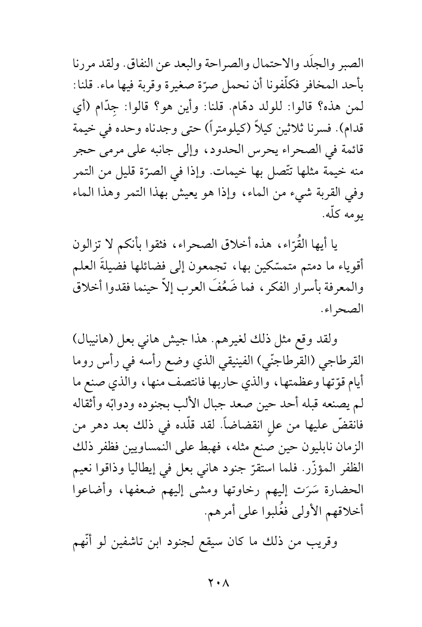يا أيها القُرّاء، هذه أخلاق الصحراء، فثقوا بأنكم لا تزالون أقوياء ما دمتم متمسّكين بها، تجمعون إلى فضائلها فضيلةَ العلم والمعرفة بأسرار الفكر، فما ضَعُفَ العرب إلاّ حينما فقدوا أخلاق الصحراء.