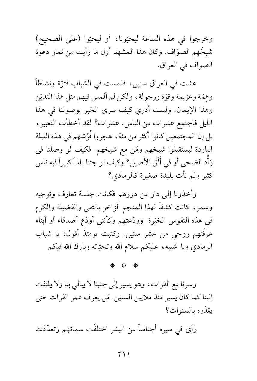 عشت في العراق سنين، فلمست في الشباب فتوّة ونشاطاً وهِمّة وعزيمة وقوّة ورجولة، ولكن لم ألمس فيهم مثل هذا التديّن وهذا الإيمان. ولست أدري كيف سرى الخبر بوصولنا في هذا الليل فاجتمع عشرات من الناس. عشرات؟ لقد أخطأت التعبير، بل إن المجتمعين كانوا أكثر من مئة، هجروا فُرُشهم في هذه الليلة الباردة ليستقبلوا شيخهم ومَن مع شيخهم. فكيف لو وصلنا في رَأْد الضحى أو في أَلَق الأصيل؟ وكيف لو جئنا بلداً كبيراً فيه ناس كثير ولم نأت بليدة صغيرة كالرمادي؟