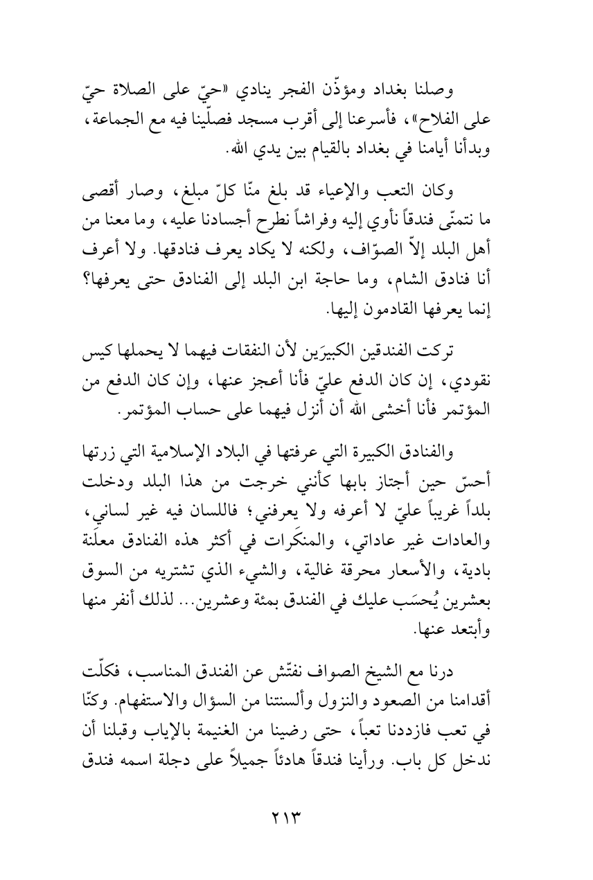درنا مع الشيخ الصواف نفتّش عن الفندق المناسب، فكلّت أقدامنا من الصعود والنزول وألسنتنا من السؤال والاستفهام. وكنّا في تعب فازددنا تعباً، حتى رضينا من الغنيمة بالإياب وقبلنا أن ندخل كل باب. ورأينا فندقاً هادئاً جميلاً على دجلة اسمه فندق