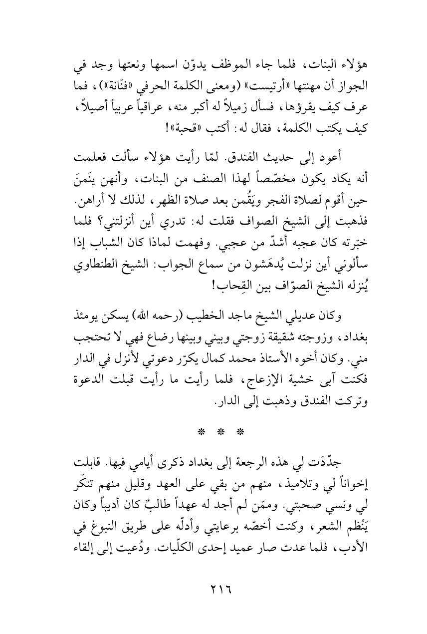 وكان عديلي الشيخ ماجد الخطيب (رحمه الله) يسكن يومئذ بغداد، وزوجته شقيقة زوجتي وبيني وبينها رضاع فهي لا تحتجب مني. وكان أخوه الأستاذ محمد كمال يكرّر دعوتي لأنزل في الدار فكنت آبى خشية الإزعاج، فلما رأيت ما رأيت قبلت الدعوة وتركت الفندق وذهبت إلى الدار.