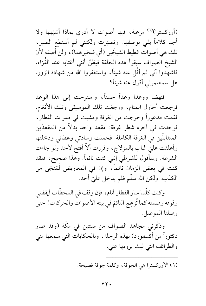 (أوركسترا) (¬1) مرعبة، فيها أصوات لا أدري بماذا أشبّهها ولا أجد كلاماً يفي بوصفها. وتصبّرت ولكنني لم أستطع الصبر، تلك هي أصوات غطيط الشيخَين (أي شخيرهما)، ولن أصفه لأن الشيخ الصواف سيقرأ هذه الحلقة فيظنّ أنني أغتابه عند القُرّاء. فاشهدوا أني لم أقُل عنه شيئاً، واستغفروا الله من شهادة الزور. هل سمعتموني أقول عنه شيئاً؟