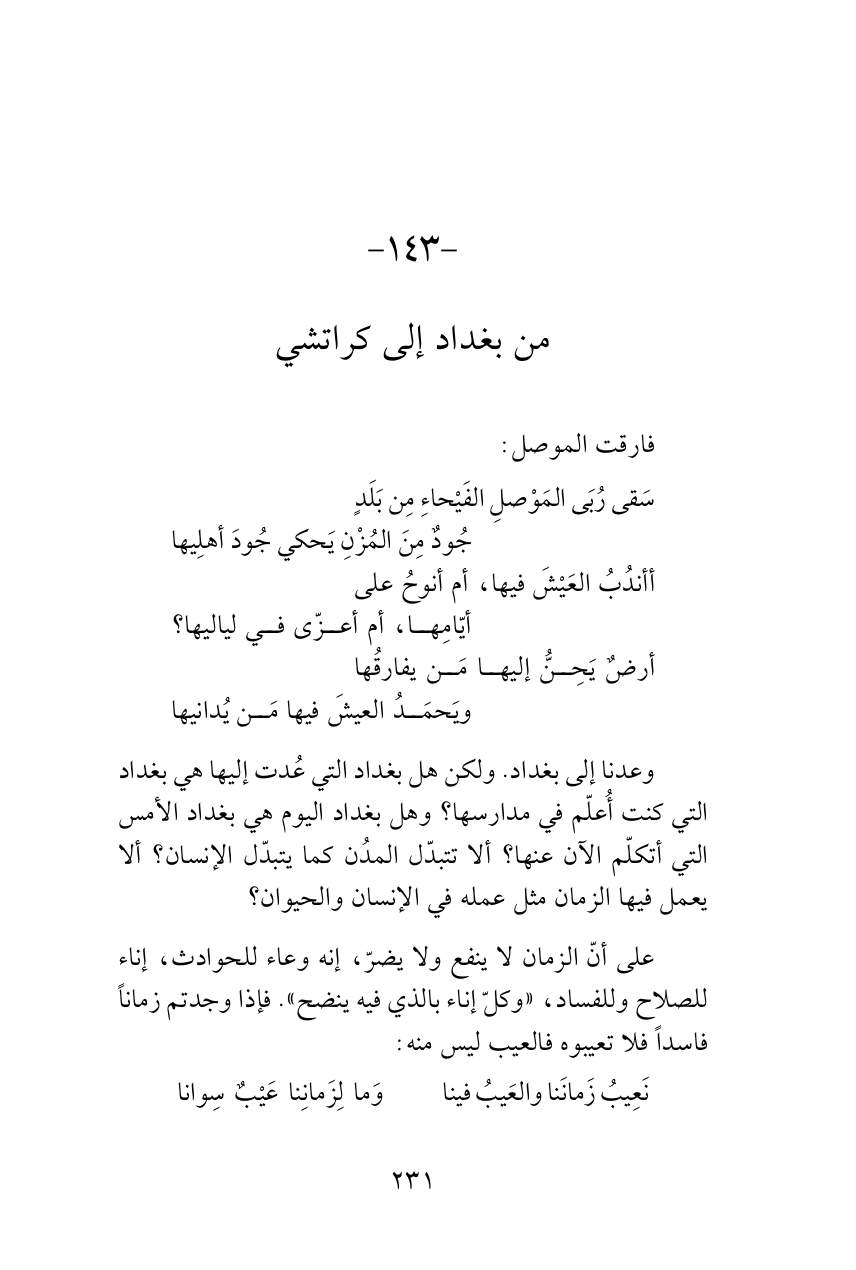 وعدنا إلى بغداد. ولكن هل بغداد التي عُدت إليها هي بغداد التي كنت أُعلّم في مدارسها؟ وهل بغداد اليوم هي بغداد الأمس التي أتكلّم الآن عنها؟ ألا تتبدّل المدُن كما يتبدّل الإنسان؟ ألا يعمل فيها الزمان مثل عمله في الإنسان والحيوان؟