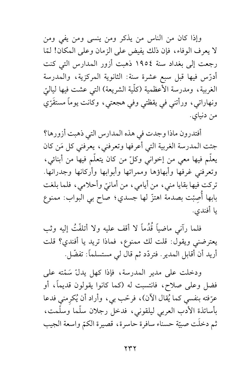 وإذا كان من الناس من يذكر ومن ينسى ومن يفي ومن لا يعرف الوفاء، فإن ذلك يفيض على الزمان وعلى المكان! لمّا رجعت إلى بغداد سنة 1954 ذهبت أزور المدارس التي كنت أدرّس فيها قبل سبع عشرة سنة: الثانوية المركزية، والمدرسة الغربية، ومدرسة الأعظمية (كلّية الشريعة) التي عشت فيها لياليّ ونهاراتي، ورأتني في يقظتي وفي هجعتي، وكانت يوماً مستقَرّي من دنياي.