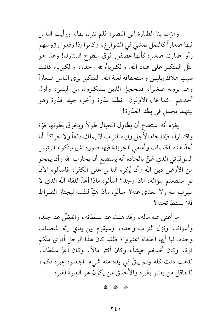 ومرّت بنا الطيارة إلى البصرة فلم تنزل بها، ورأيت الناس فيها صغاراً كالنمل تمشي في الشوارع، وكانوا إذا رفعوا رؤوسهم رأوا طيارتنا صغيرة كأنها عصفور فوق سطوح المنازل! وهذا هو مَثَل المتكبر على عباد الله. والكبرياءُ لله وحده، والكبرياء كانت سبب هلاك إبليس واستحقاقه لعنة الله. المتكبر يرى الناس صغاراً وهم يرونه صغيراً، فليخجل الذين يستكبرون من البشر، وأوّل أحدهم -كما قال الأوّلون- نطفة مذرة وآخره جيفة قذرة وهو بينهما يحمل في بطنه العذرة!