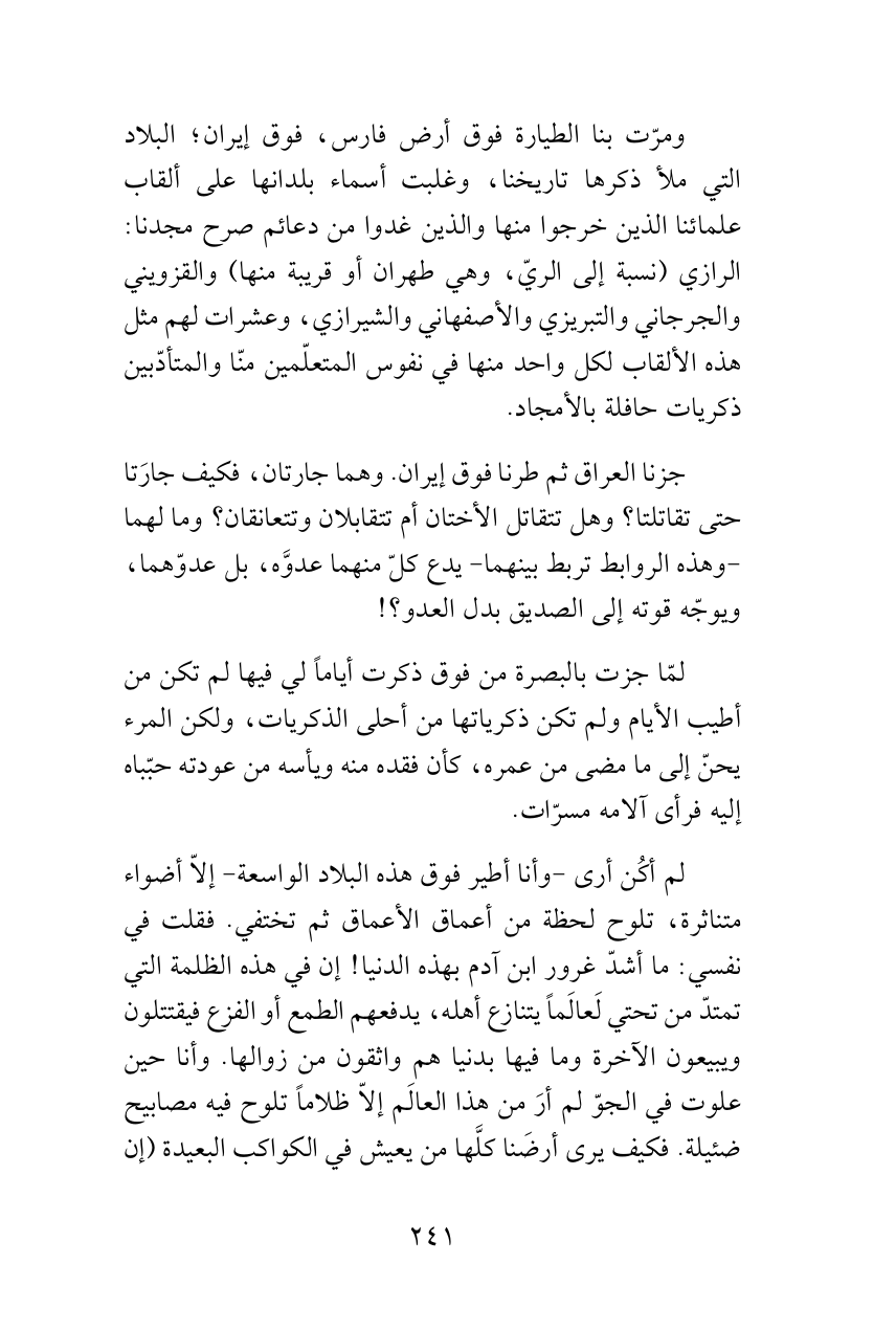ومرّت بنا الطيارة فوق أرض فارس، فوق إيران؛ البلاد التي ملأ ذكرها تاريخنا، وغلبت أسماء بلدانها على ألقاب علمائنا الذين خرجوا منها والذين غدوا من دعائم صرح مجدنا: الرازي (نسبة إلى الريّ، وهي طهران أو قريبة منها) والقزويني والجرجاني والتبريزي والأصفهاني والشيرازي، وعشرات لهم مثل هذه الألقاب لكل واحد منها في نفوس المتعلّمين منّا والمتأدّبين ذكريات حافلة بالأمجاد.