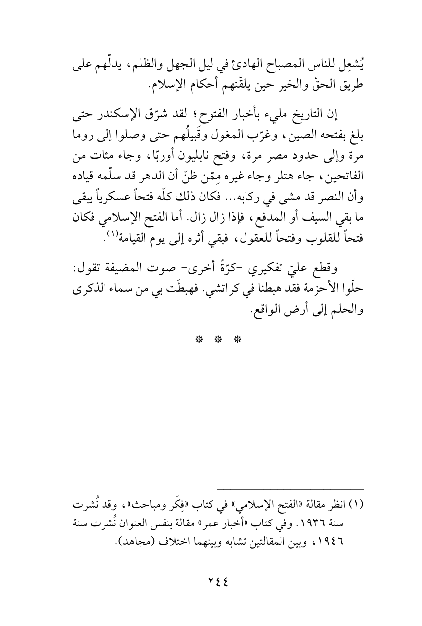 (¬1) انظر مقالة «الفتح الإسلامي» في كتاب «فِكَر ومباحث»، وقد نُشرت سنة 1936. وفي كتاب «أخبار عمر» مقالة بنفس العنوان نُشرت سنة 1946، وبين المقالتين تشابه وبينهما اختلاف (مجاهد).
